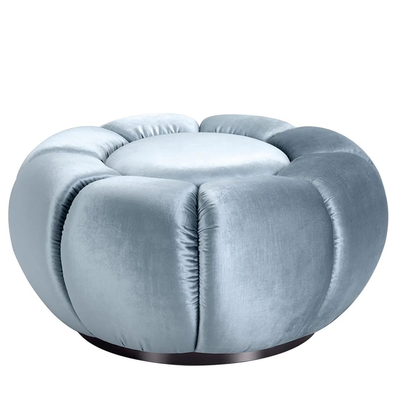 Ricordando l’aspetto dei boccioli di un fiore, questo pouf circolare realizzato a mano fa parte di una sofisticata collezione ispirata ad Arke, dea della mitologia greca e messaggera dei Titani. La texture canalizzata conferita alla seduta aggiunge carattere al delicato rivestimento in velluto azzurro, ulteriormente illuminato dalla luminosa base rotonda in laminato che sostiene il design.