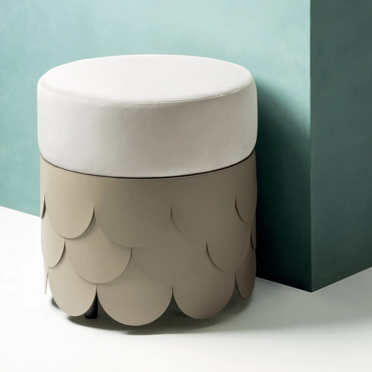 Questo bellissimo e moderno pouf è un pezzo unico che vanta una struttura in legno nella parte inferiore, un cuscino in tessuto imbottito bianco nella parte superiore e una gonna smerlata beige realizzata in pregiata pelle rigenerata con finitura resistente all’acqua e ai raggi UV. Questo pezzo sarà un’aggiunta perfetta a qualsiasi casa o ufficio.