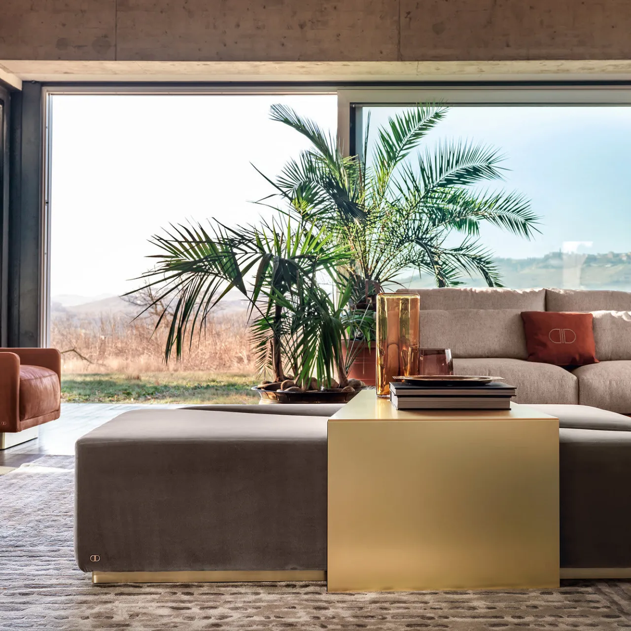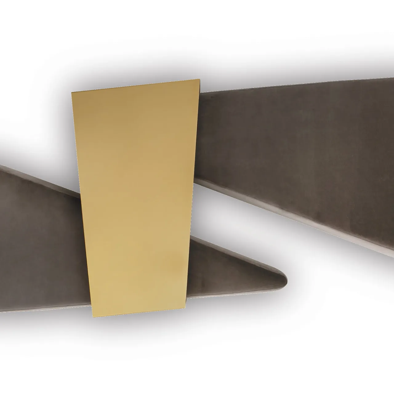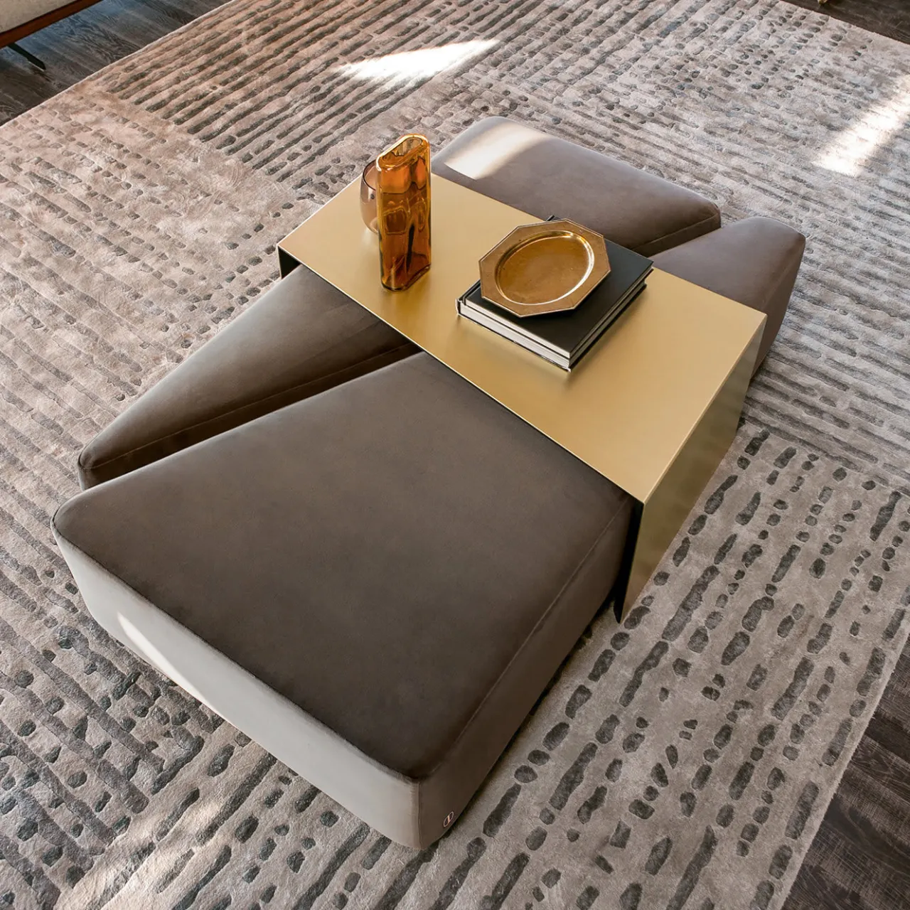 La composizione Atollo rappresenta un tavolino/pouff con struttura in multistrato imbottito in gomma multi-densità. Originale ed elegante, è costituito da 2 sezioni (triangoli), 1 con piano rigido e 1 con piano morbido. Le basi sono in laminato di ottone satinato. Il ponte è strutturato in multistrato laccato fumo lucido con laminato di ottone satinato da 3 mm.