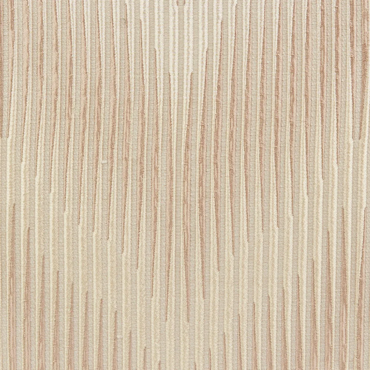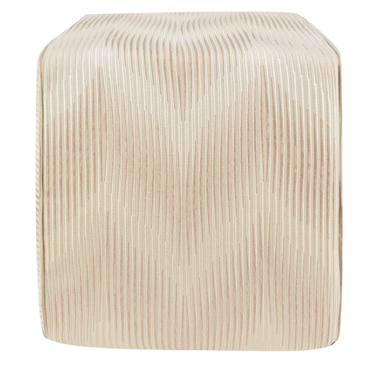 Pouf a cubo beige, rivestito con un motivo chevron multicolore sbiadito con tecnica jacquard e profili tubolari a contrasto.