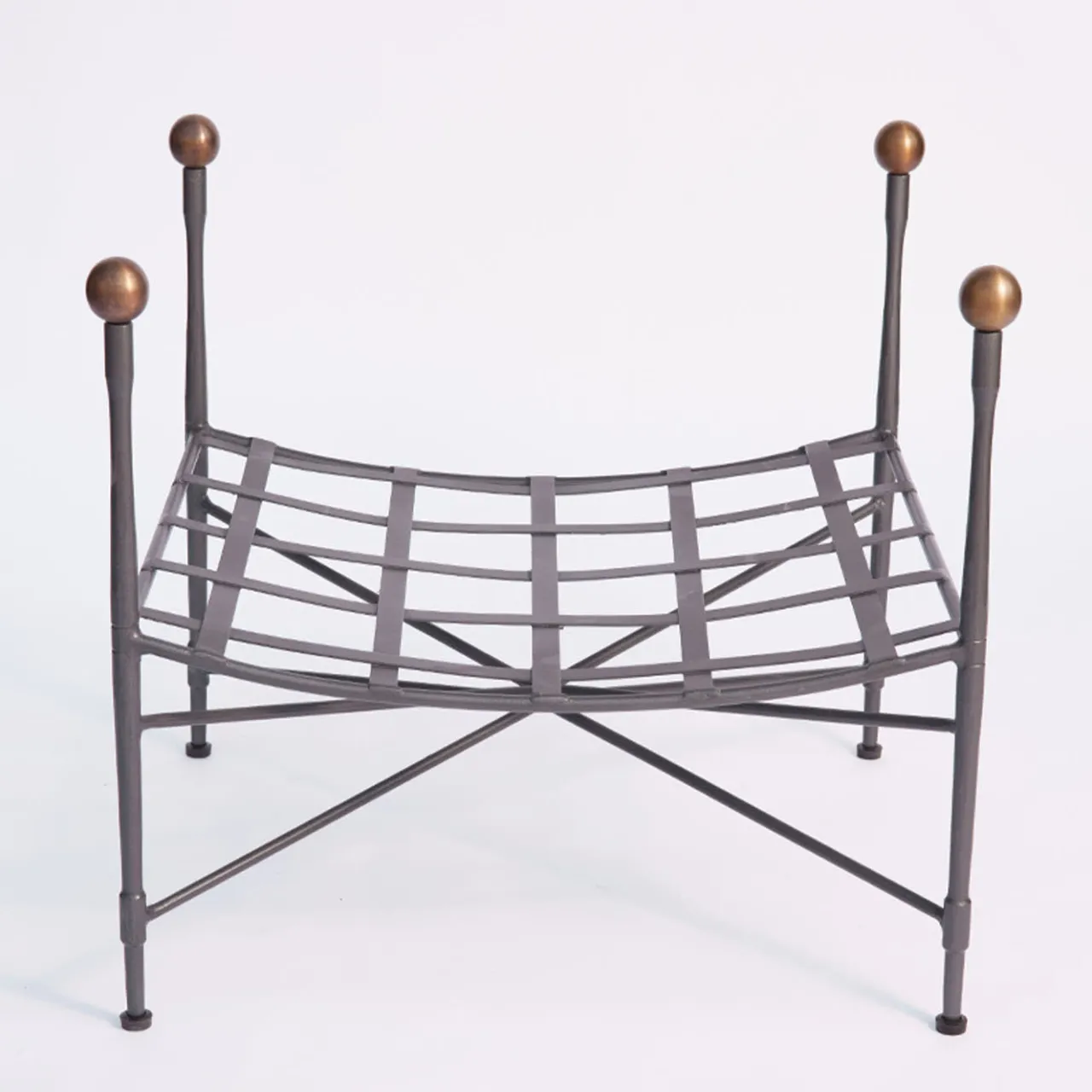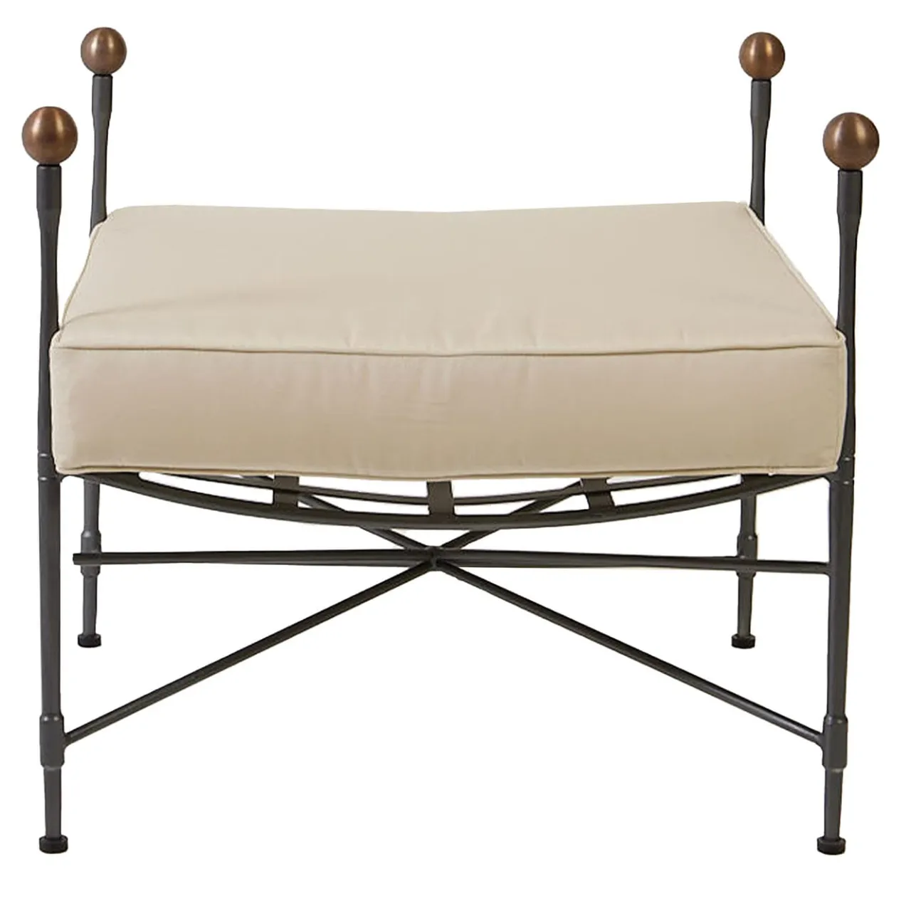 Raffinatezza e durata definiscono questo esclusivo pouf artigianale progettato per un uso sicuro all’esterno. Arricchita da pomelli in ottone brunito, la struttura in ferro a trama incrociata – zincata a caldo e verniciata a fuoco in grigio grafite – accoglie una soffice e sfoderabile cuscinatura beige denominata Sunbrella “Canvas” che garantisce resistenza sia all’acqua che alle macchie. È disponibile anche una versione simile, più bassa.