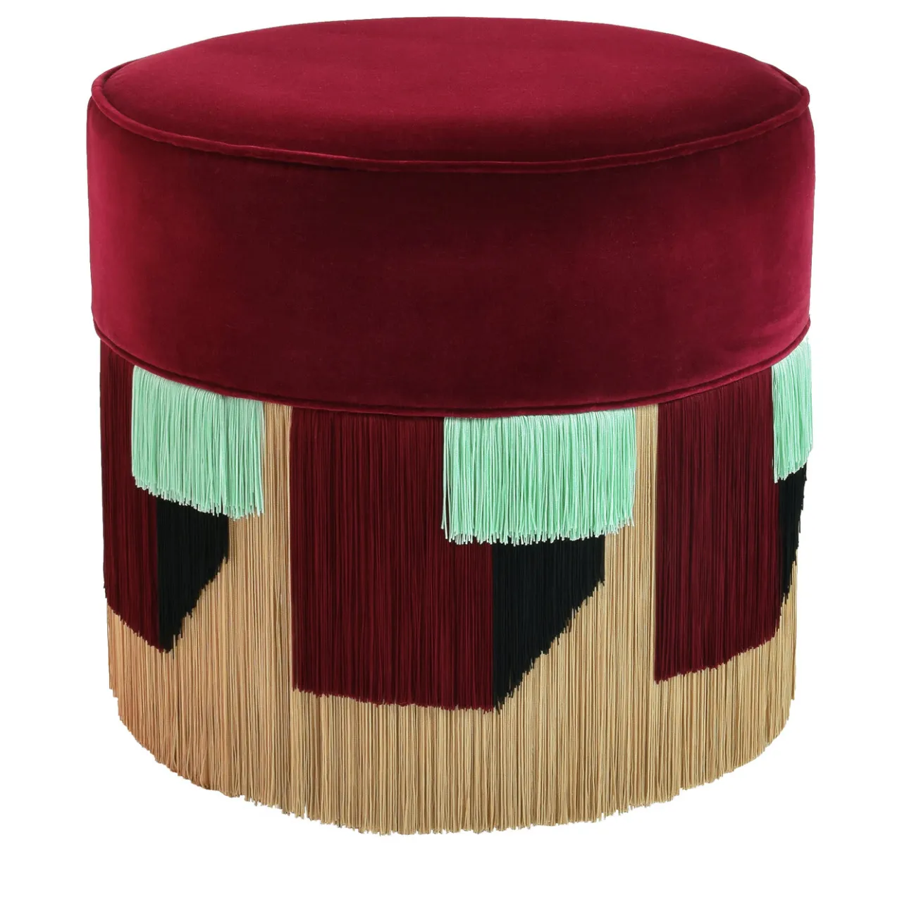 Pouf in legno di faggio a cilindro rosso con frangia geometrica*Lorenza Bozzoli Couture Best