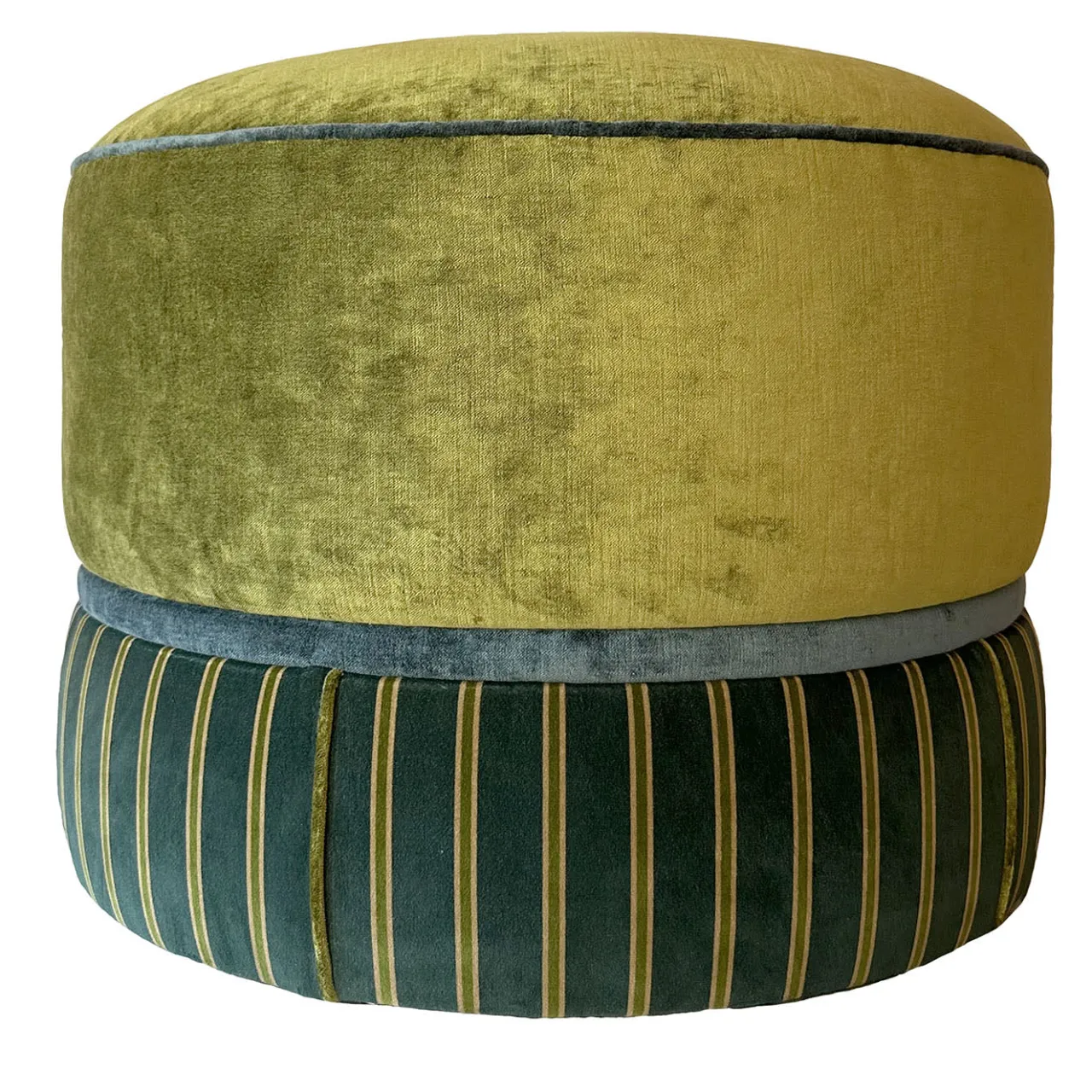 Una sapiente combinazione di motivi a righe e aree a tinta unita conferisce a questo pouf il suo caratteristico dinamismo che, insieme ai toni verdi a contrasto, ne rivela immediatamente la personalità glamour. Ampio e soffice, presenta un’anima in legno massiccio completamente avvolta da una miscela di velluto di cotone e viscosa. La struttura in legno non può essere aperta.