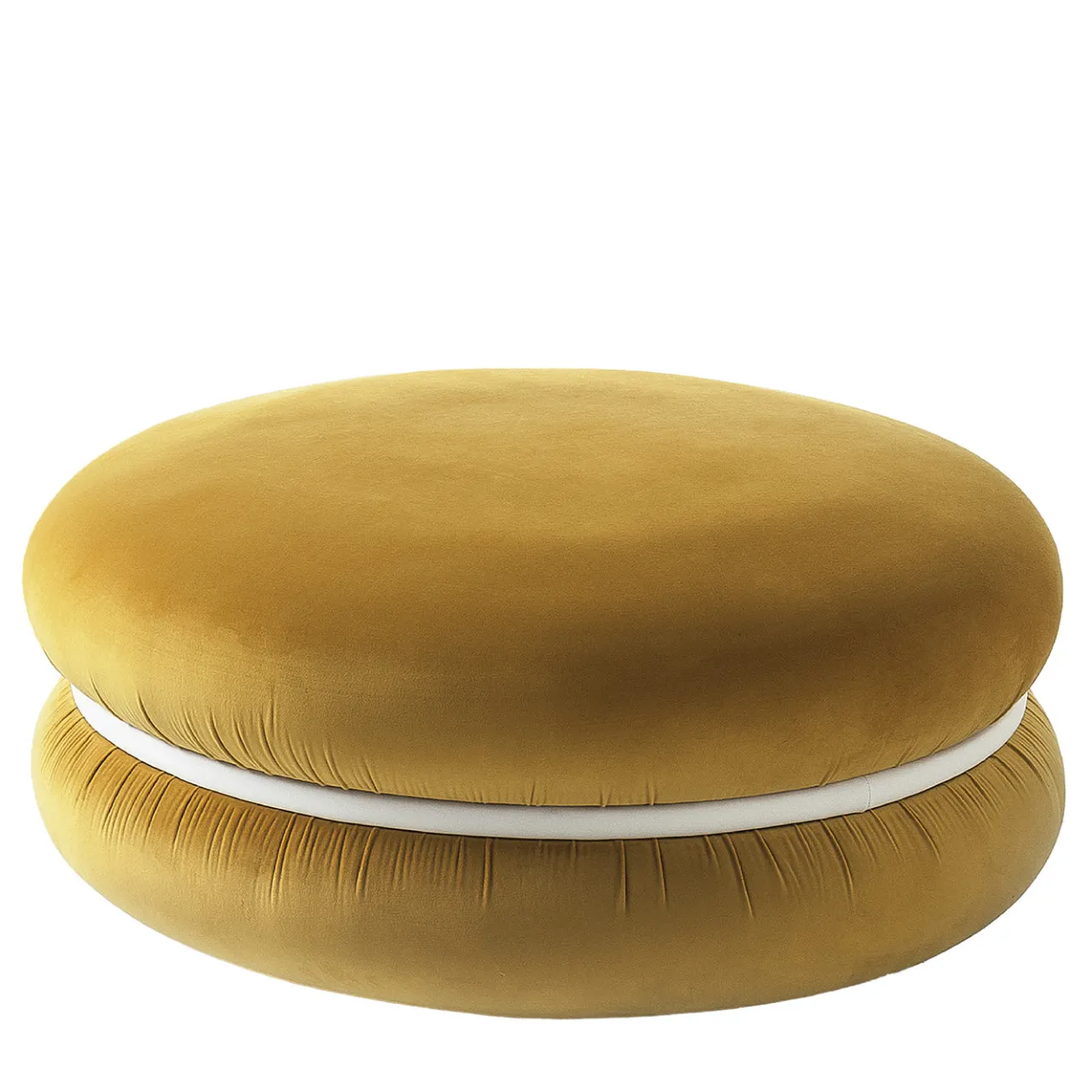 Vivace e vibrante, questo pouf a forma di macaron si abbina perfettamente a due gemelli in tonalità assortite, per un giocoso arcipelago di macarons che non mancherà di rallegrare qualsiasi casa contemporanea. Un anello bianco comprime i suoi soffici volumi rivestiti in vellutato tessuto senape per ottenere la sua forma caratteristica, conferendogli un fascino inconfondibile. Perfetto come pouf o come soluzione di seduta informale. Chiedere al Concierge per altri colori.