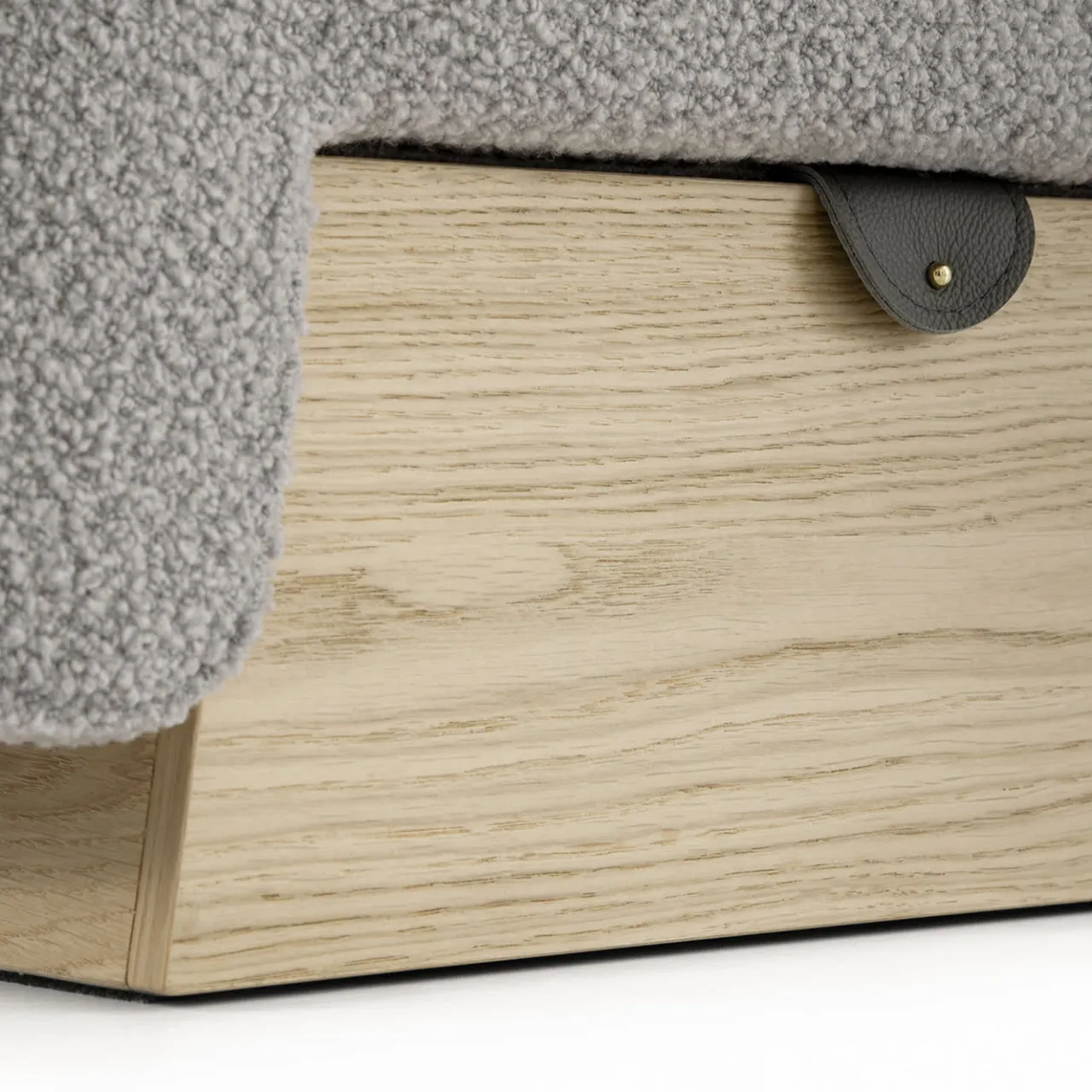 Una celebrazione del comfort contemporaneo e dell’artigianato, questo pouf affascina con il suo lussuoso rivestimento in bouclé grigio perla e l’elegante chiusura a strap in pelle antracite. L’imbottitura in schiuma ad alta densità garantisce comfort e durata, mentre l’interno rivela un pratico vano portaoggetti realizzato in MDF impiallacciato Rovere Naturale. Questo pezzo, che incarna eleganza e funzionalità, è un’aggiunta sofisticata a qualsiasi spazio abitativo moderno.