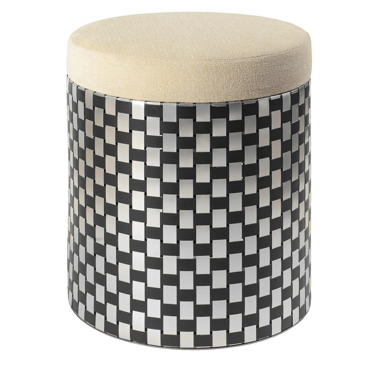 Ispirato al movimento Optical Art degli anni ’60, questo splendido pouf sfoggia un design visivamente accattivante e scintillante, realizzato intrecciando doghe di alluminio nero e naturale riciclate da rifiuti industriali, una tecnica nota come Splot. Con una classica silhouette cilindrica completata da un raffinato cuscino beige, sarà un’aggiunta calda e sofisticata a un interno moderno.