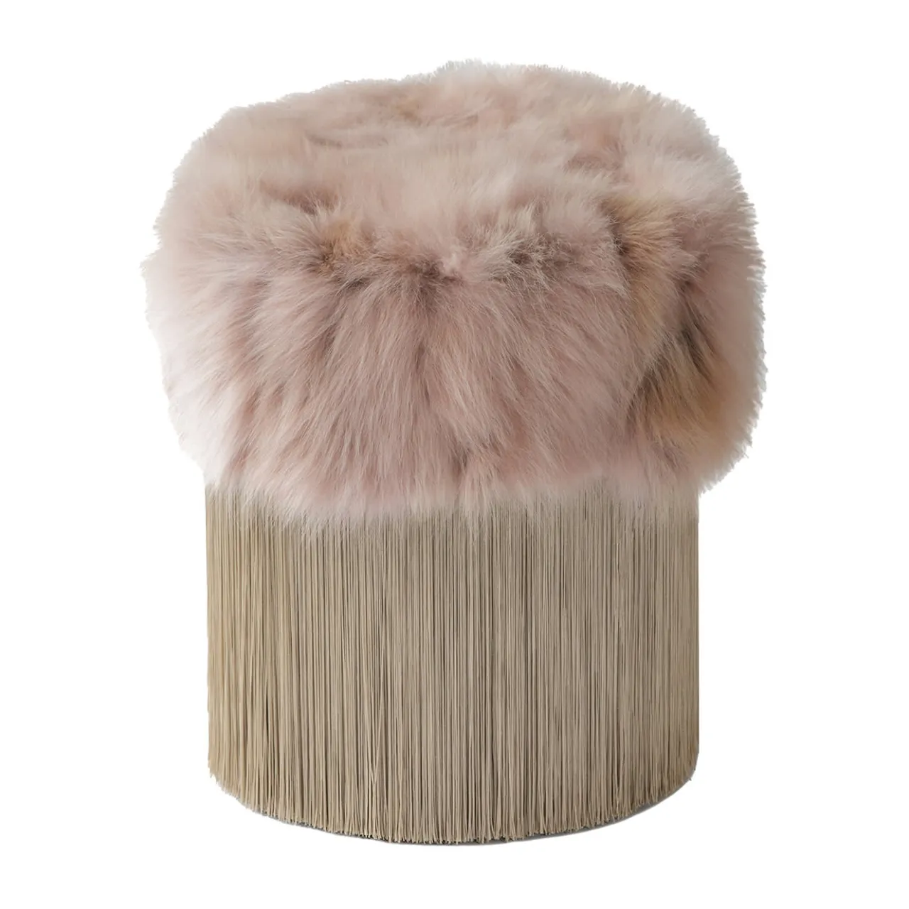 Lorenza Bozzoli Couture presenta una collezione in edizione limitata caratterizzata da un design estremamente morbido, eclettico e decisamente retrò. La nuova Fur Collection propone i pezzi iconici di Couture in versione pelosa, con colori ispirati agli anni Settanta e sofisticati rivestimenti in pelliccia che enfatizzano le forme avvolgenti e morbide per un effetto cocoon. Pouf in pelliccia di coyote rosa cipria, calda e morbida, con frange beige. Struttura e gambe in legno di faggio. Edizione limitata di 10 pezzi.