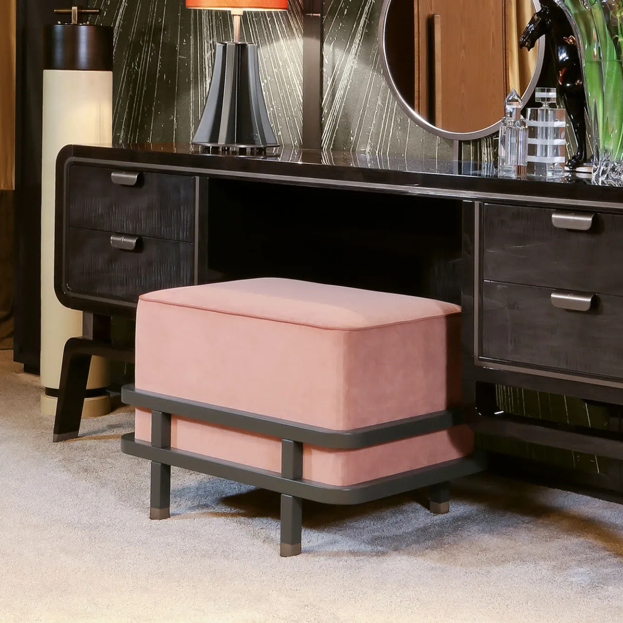 Realizzato con una struttura in legno e rifinito con una vernice poliestere opaca in grigio umbra, questo elegante pouf presenta una lussuosa seduta imbottita in velluto. Accentuato da dettagli in metallo satinato biotite, unisce stile e raffinatezza. Disponibile in diverse finiture su richiesta, tra cui tessuto, pelle, nabuk, ecopelle ed econabuk. È disponibile anche la certificazione CAL TB 117 con opzioni di tessuto alternative su richiesta.