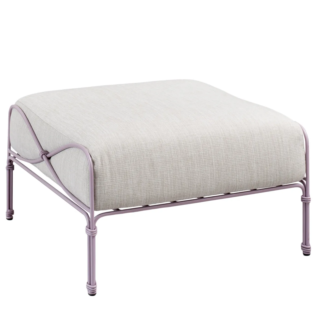 Femminile nelle sue linee sinuose e aggraziate, ispirate agli intricati tralci delle viti, il robusto telaio in acciaio inox di questo pouf è qui verniciato a polvere in una delicata tonalità di lilla (RAL 4009). Un cuscino generosamente imbottito e rivestito in tessuto beige rende la seduta eccezionalmente comoda e stabile anche quando viene utilizzata come tavolino occasionale per appoggiare un vassoio per un aperitivo all’aperto.