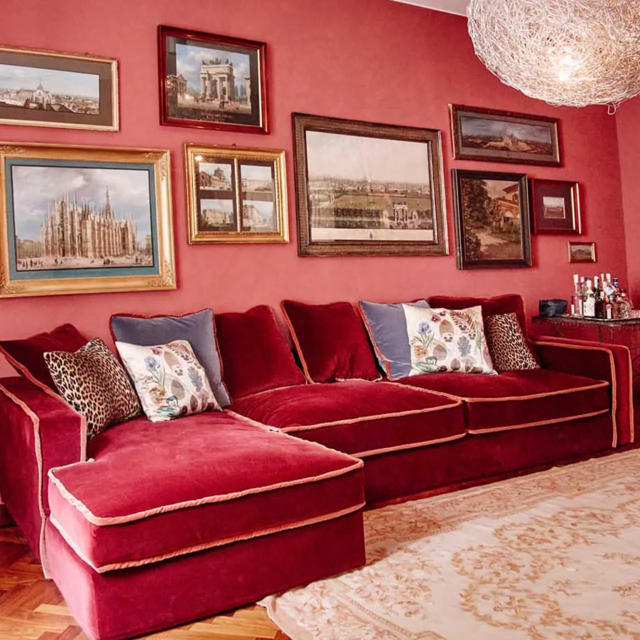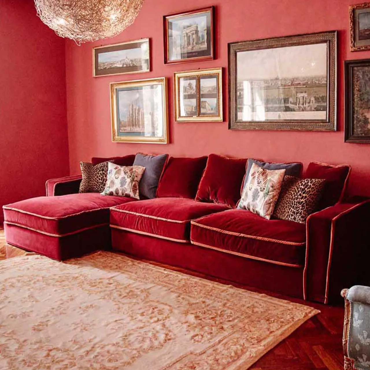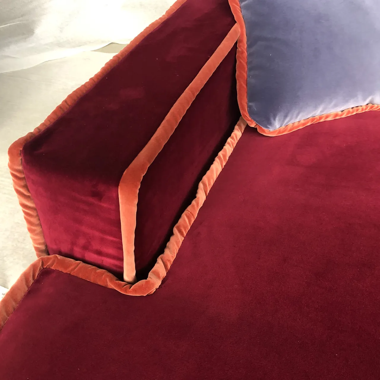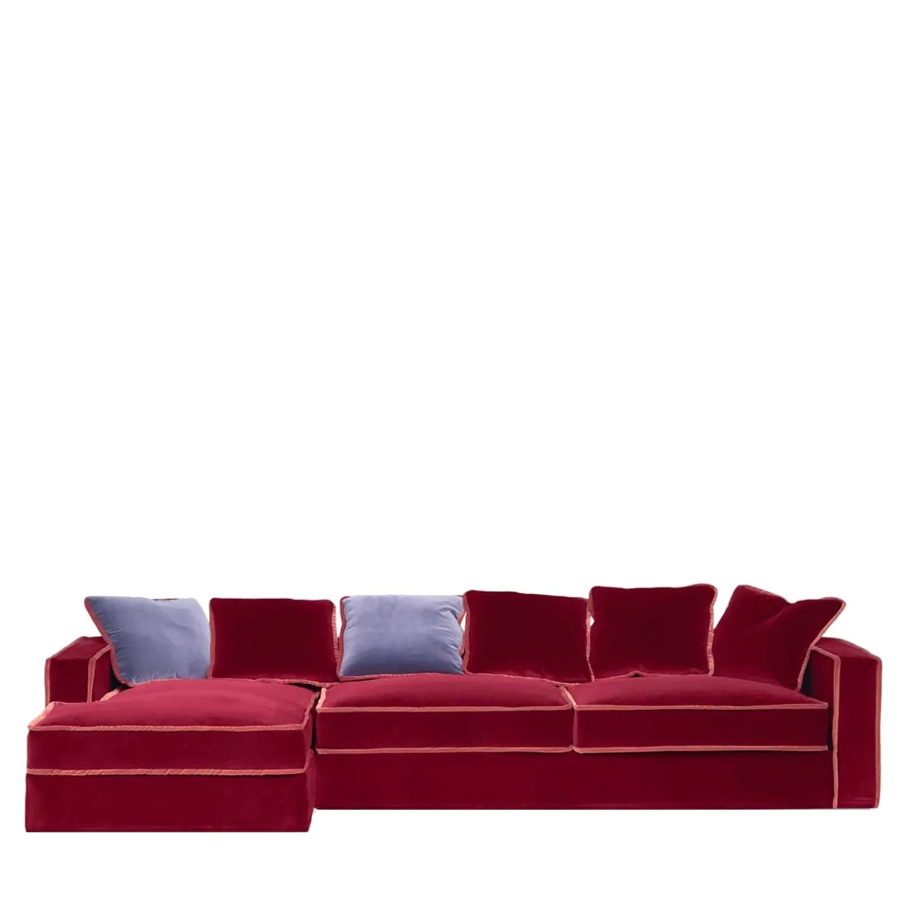 Il profilo angolare di Rafael conferisce a questo stile revival un tocco di modernità e i suoi cuscini morbidi aggiungono comfort al divano. Perfetto per rilassarsi la sera, Rafael è un’aggiunta deliziosamente accogliente e chic a qualsiasi casa. Questo modello a forma di L è caratterizzato da un’accattivante combinazione di velluto rosso intenso con un bordo di velluto arancione arrugginito. Materiali: 100% lattice naturale, imbottitura in piuma d’oca, struttura interna in legno massiccio di faggio essiccato, cinghie di juta con molle d’acciaio, imbottitura in cotone pressato. Cuscini decorativi inclusi.