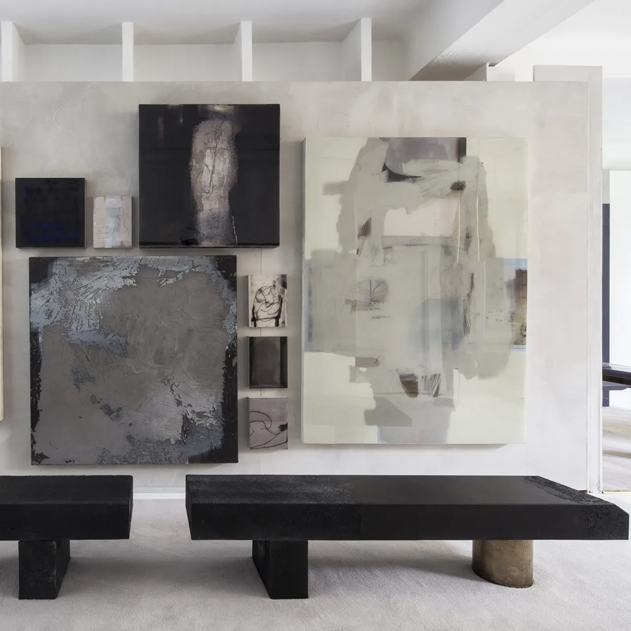 Solida e materica, Rive è una panca imponente che esprime l’estetica dell’architettura megalitica attraverso l’assemblaggio di tre componenti strutturali essenziali. La seduta dai bordi irregolari poggia su una gamba cubica in cemento e su un cilindro in ottone, le cui venature sono ottenute mediante un trattamento di acidatura. La superficie del cemento, invece, alterna porzioni perfettamente lisce ad altre corrose, realizzate con una tecnica manuale che prevede l’uso del sale marino.