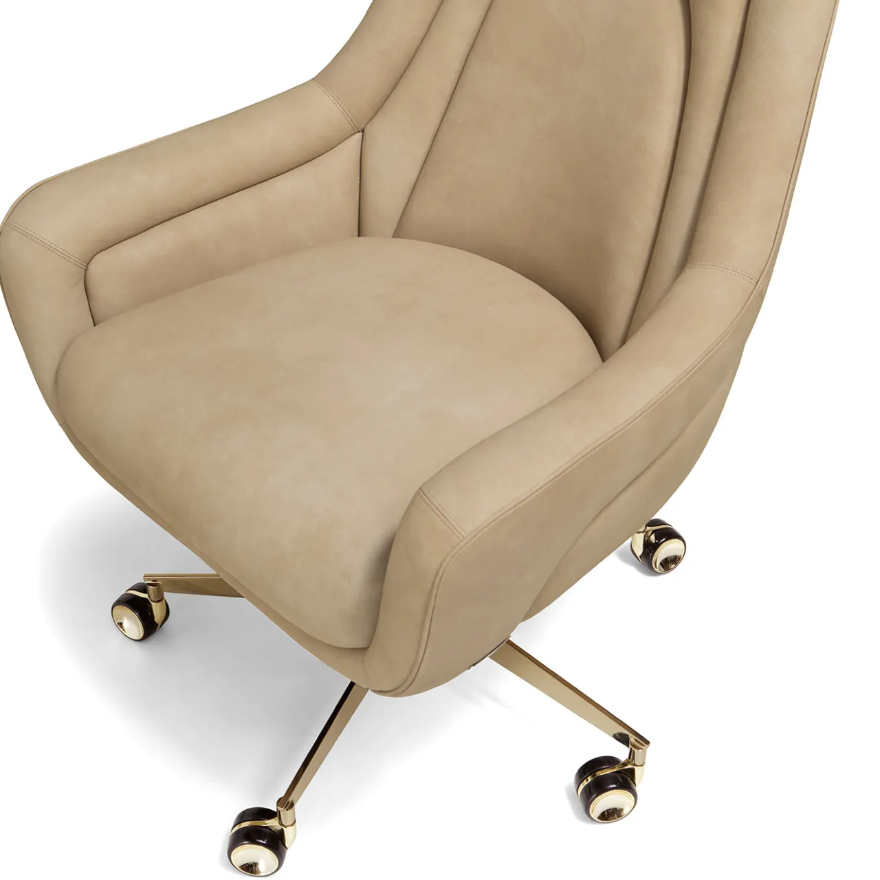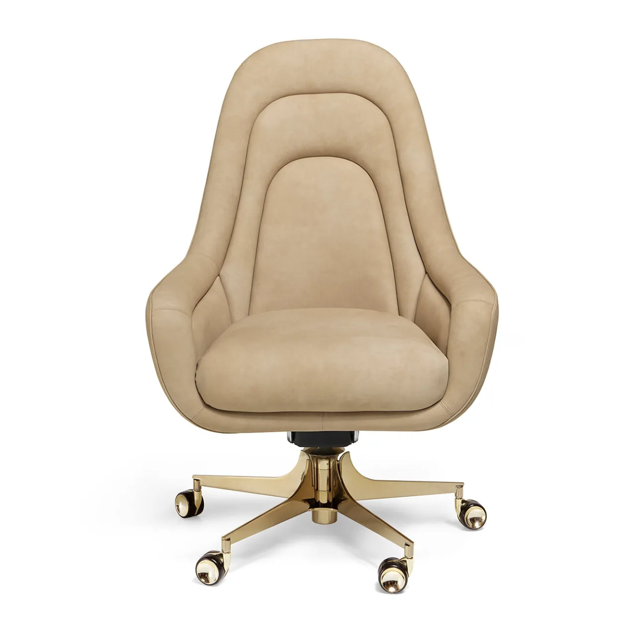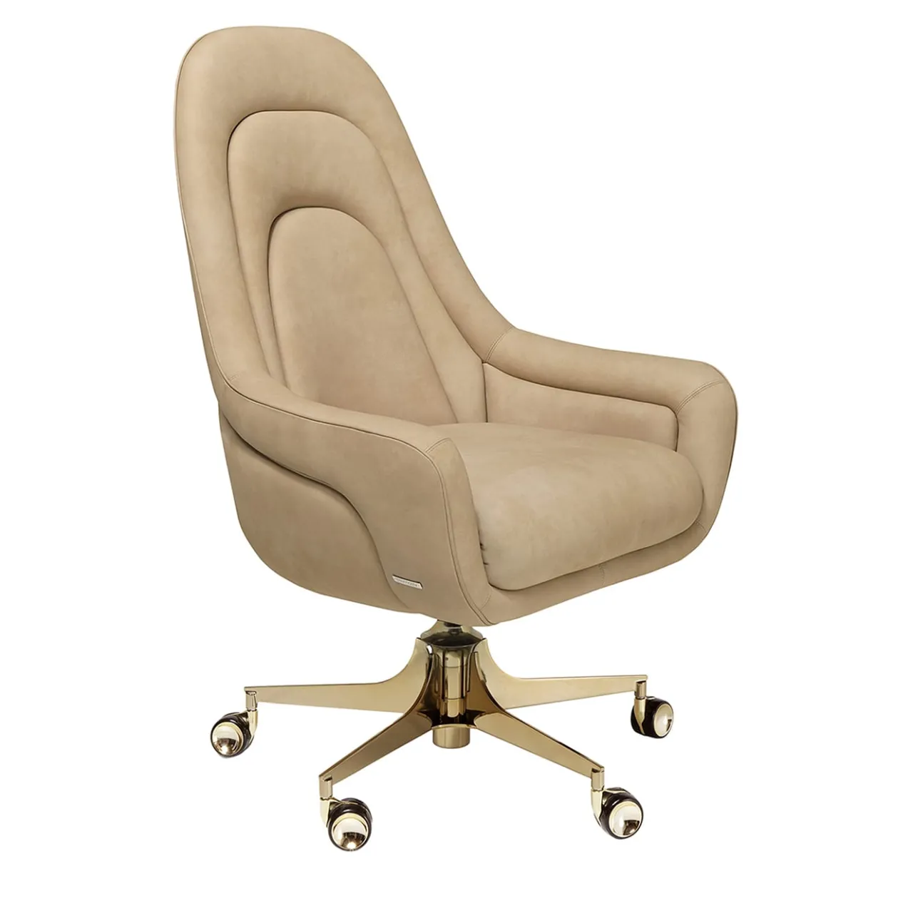La sedia da ufficio Sadko unisce lusso e comfort grazie alla sua struttura in legno multistrato curvato e all’imbottitura a densità differenziata. Rivestita in pelle Nabuk Sequoia Beige, i braccioli e lo schienale presentano un design a tre zone. La scocca esterna, rivestita in pelle o tessuto con cuciture decorative, aggiunge eleganza. La base a cinque razze in acciaio inox con rotelle e il pistone girevole imbottito regolabile in altezza sono disponibili in acciaio dorato.
