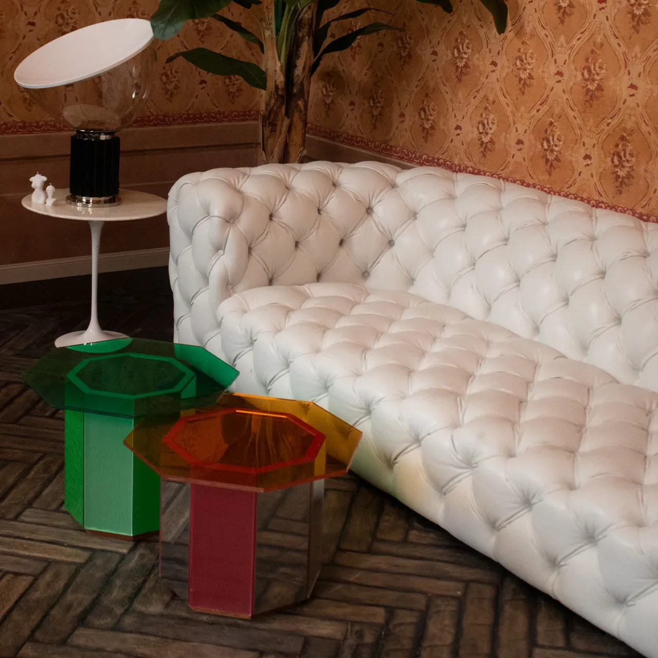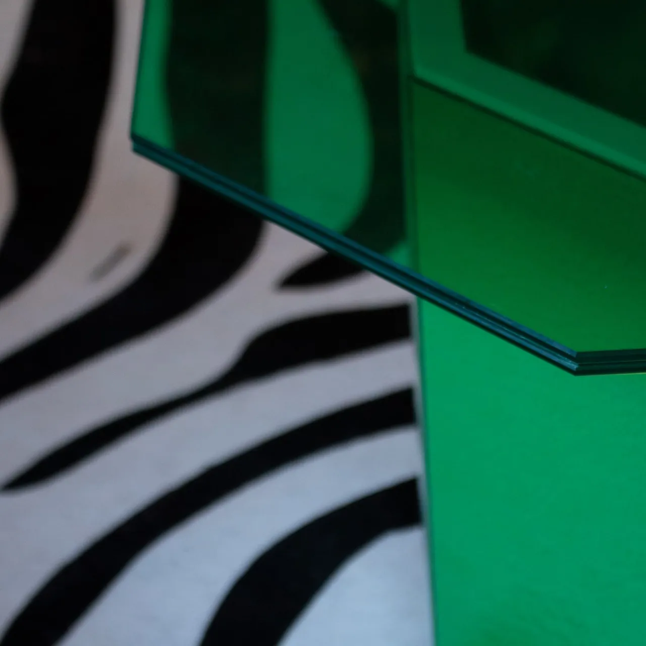 Un vibrante oggetto d’arte che si inserisce in modo dinamico in qualsiasi ambiente moderno e può essere abbinato ad altri elementi della stessa serie. Questo tavolino è caratterizzato da una base ottagonale in legno rivestito di vetro verde e da un piano ottagonale irregolare in vetro specchiato verde. Misura 50x50x35 cm.