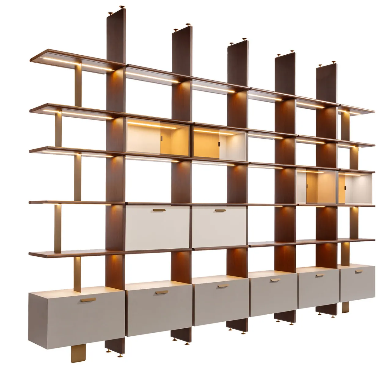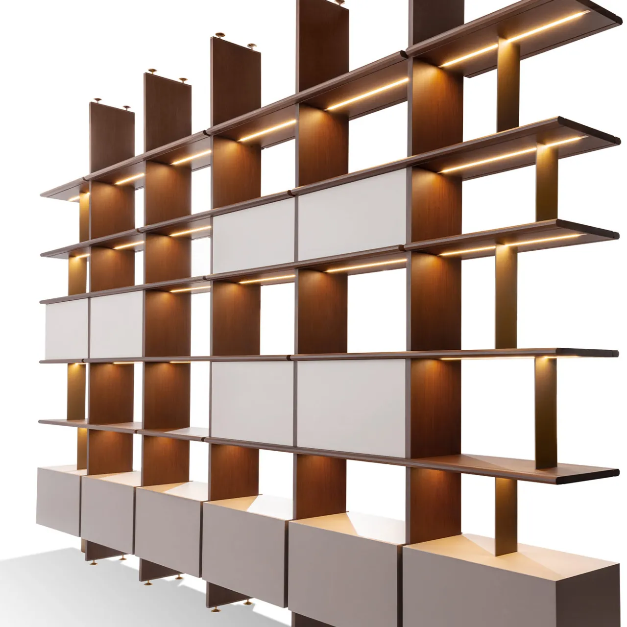 Vera e propria opera d’arte che supera la funzionalità del design, questo spettacolare sistema di scaffali infonderà raffinatezza in qualsiasi interno classico o moderno. Con una struttura audace abilmente lavorata a mano in noce canaletto con finitura caffè opaco, è arricchita da contenitori laccati in bianco sfumato, dotati a scelta di illuminazione a LED. Disponibile in altre dimensioni, finiture e personalizzazioni, si prega di chiedere al Concierge per i dettagli.