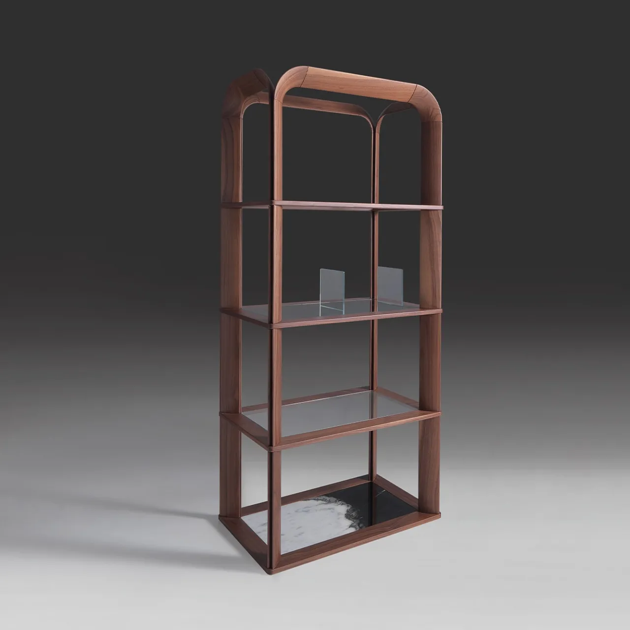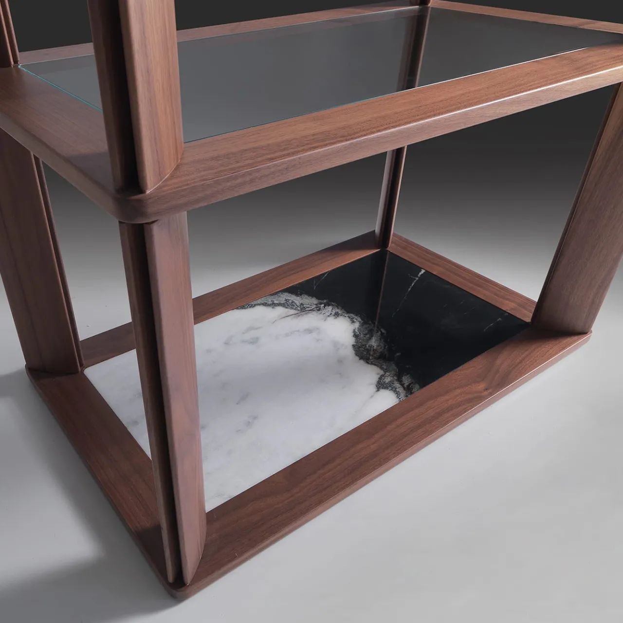 Un design senza tempo, questa scaffalatura sarà il complemento ideale per un arredamento pulito in stile contemporaneo. Realizzato in noce canaletto, presenta tre ripiani in vetro e un ripiano inferiore in marmo Dalmata. Per ulteriori informazioni e opzioni di personalizzazione, consultare il Concierge.