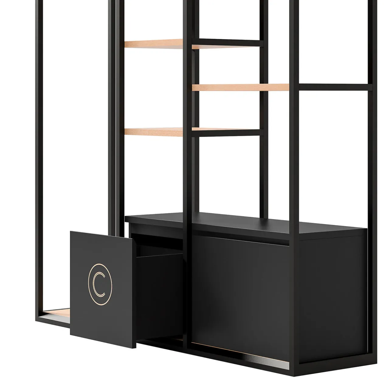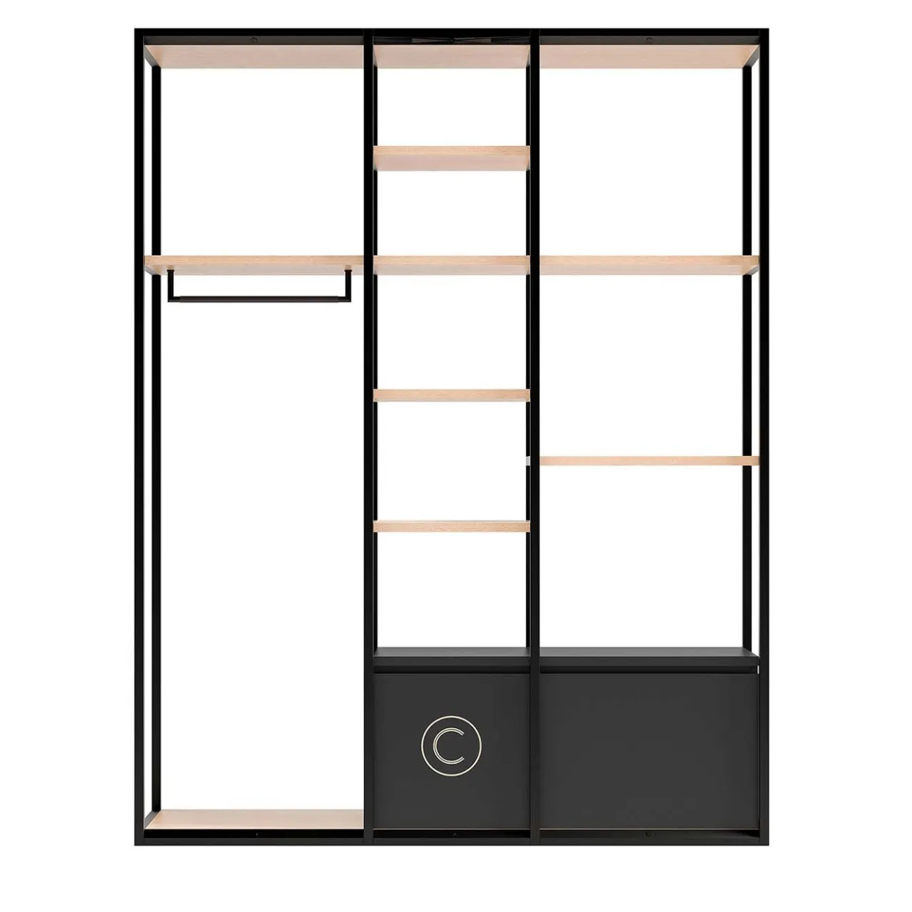 Il fascino minimalista e l’aspetto fluttuante di questa sofisticata scaffalatura aggiungeranno stile a una camera da letto moderna e minimalista. Questo pezzo eclettico è incorniciato in metallo con finitura nera e ripiani impiallacciati chiari e comprende tre sezioni, ognuna con accessori diversi, per fornire un’ampia gamma di contenitori funzionali in una silhouette aperta. La colonna centrale è dotata di quattro ripiani e un cassetto inferiore, mentre le sezioni laterali comprendono un’asta per appendere e due ripiani con un cassetto inferiore. Questo mobile versatile è la soluzione perfetta per i piccoli spazi residenziali.