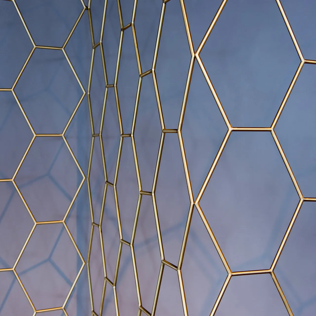 Questo paravento in ottone con finitura dorata, che prende il nome di “Favo” dall’italiano “nido d’ape”, ravviva qualsiasi ambiente con la sua splendida geometria e il suo elegante stile architettonico. Questo progetto dell’architetto italiano Daniele Della Porta può essere personalizzato con l’aggiunta di accessori (come portabottiglie, mensola, videopoche, ganci per appendiabiti, portavasi e altro) per formare una miriade di eleganti composizioni adatte alle funzioni e allo spazio in cui vengono collocate. Contattare il Concierge per un elenco di accessori che possono essere ordinati separatamente.
