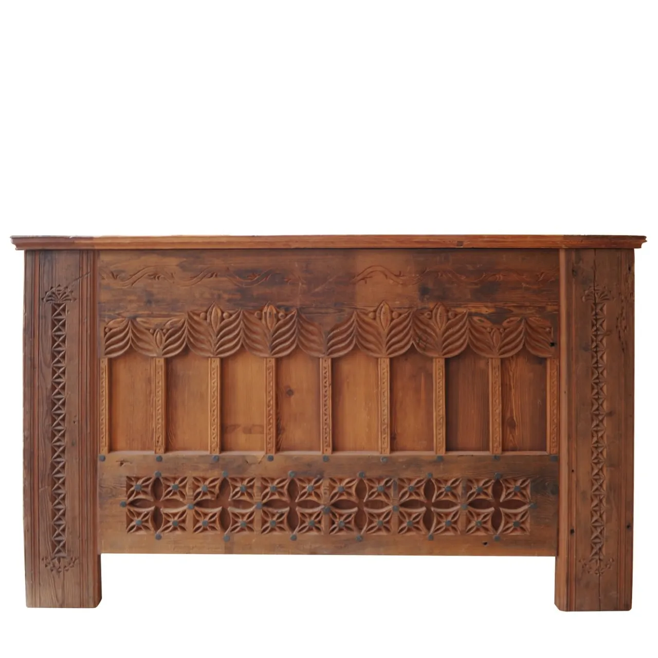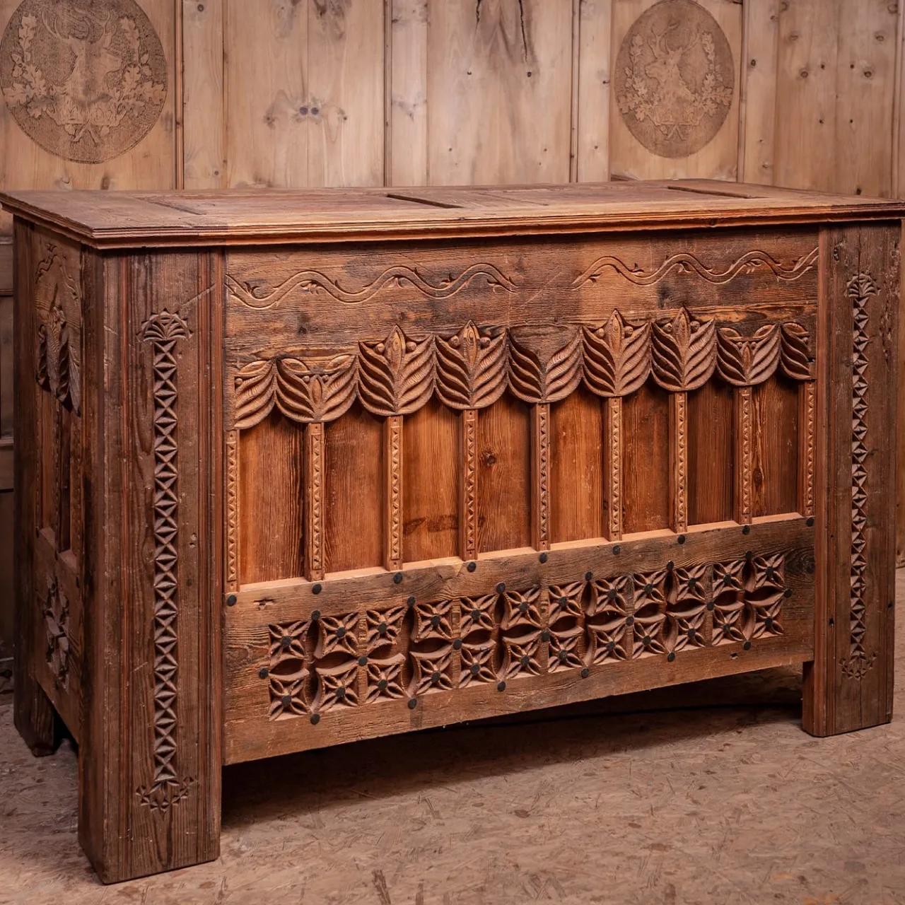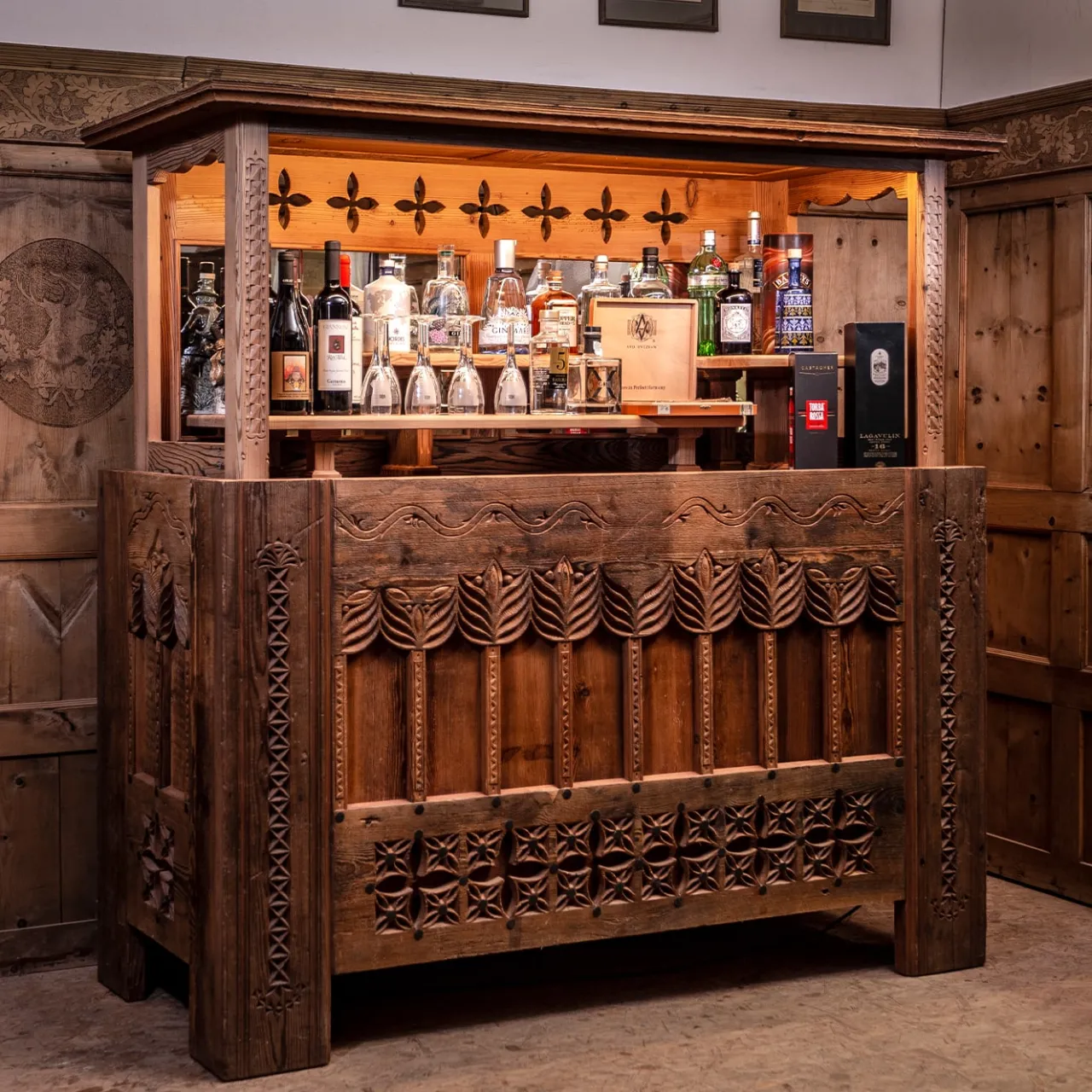 Questo cassettone si ispira allo stile gotico della regione dell’Elsass, in Francia, al confine con la Germania. Il suo fascino unico deriva dal larice utilizzato per la sua realizzazione, che ha tra i 400 e i 600 anni. Gli ornamenti intagliati a mano sulla parte anteriore e superiore conferiscono alla casa un’atmosfera calda e rustica. Il pezzo si apre automaticamente premendo un pulsante sul lato, grazie a un sistema idraulico (disponibile anche con telecomando su richiesta). Questo pezzo può essere realizzato anche in dimensioni più piccole: chiedete al Concierge per i dettagli.