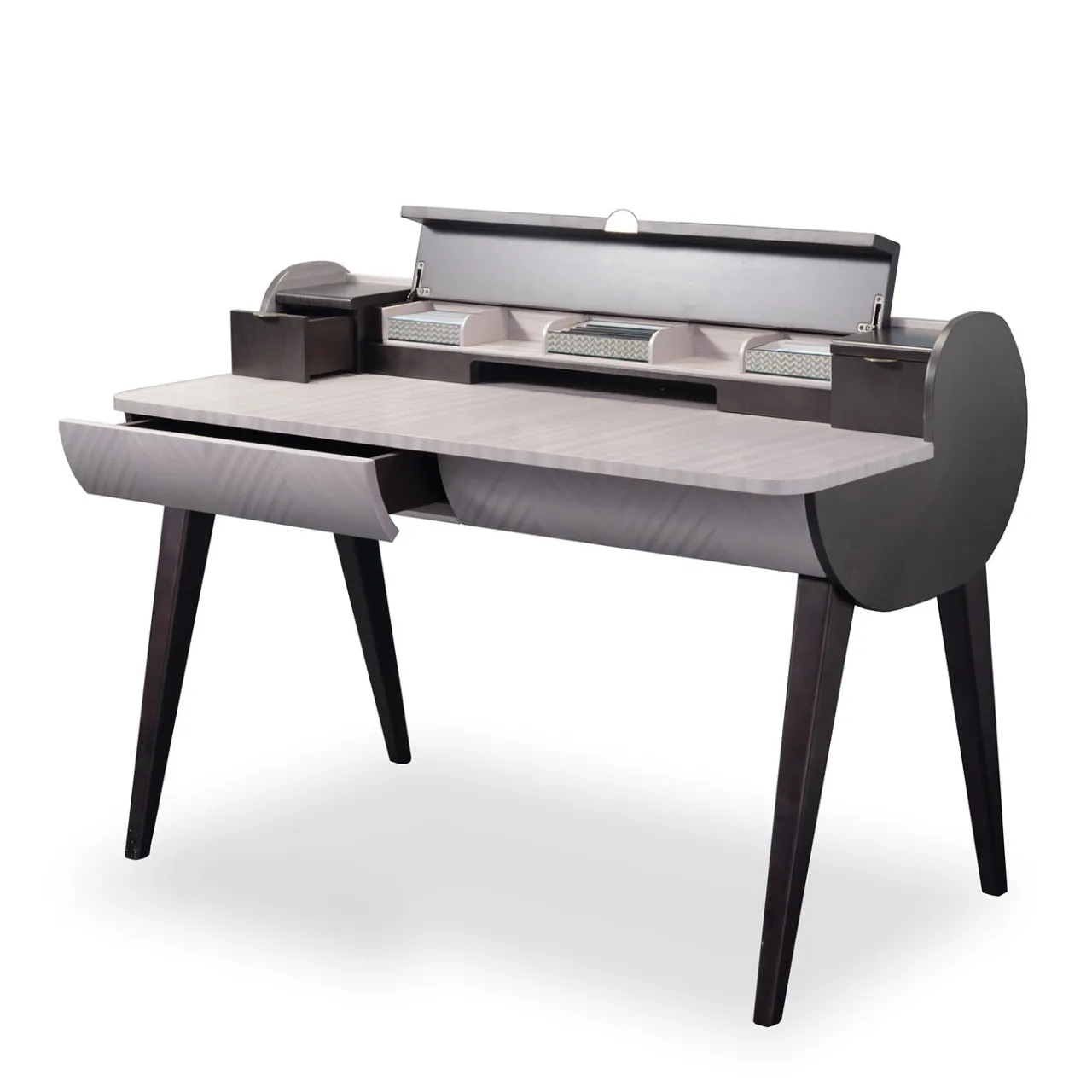 Create uno spazio di lavoro stimolante con lo scrittoio 2019. Con gambe svasate che ricordano gli stili vintage, il tavolo presenta un piano arrotondato per un look geometrico di grande effetto. I lati e i cassetti sono realizzati in legno di sicomoro con finitura frisé scuro, mentre il pezzo centrale è in legno di Pama. Anta a ribalta orizzontale con chiusura ammortizzata.