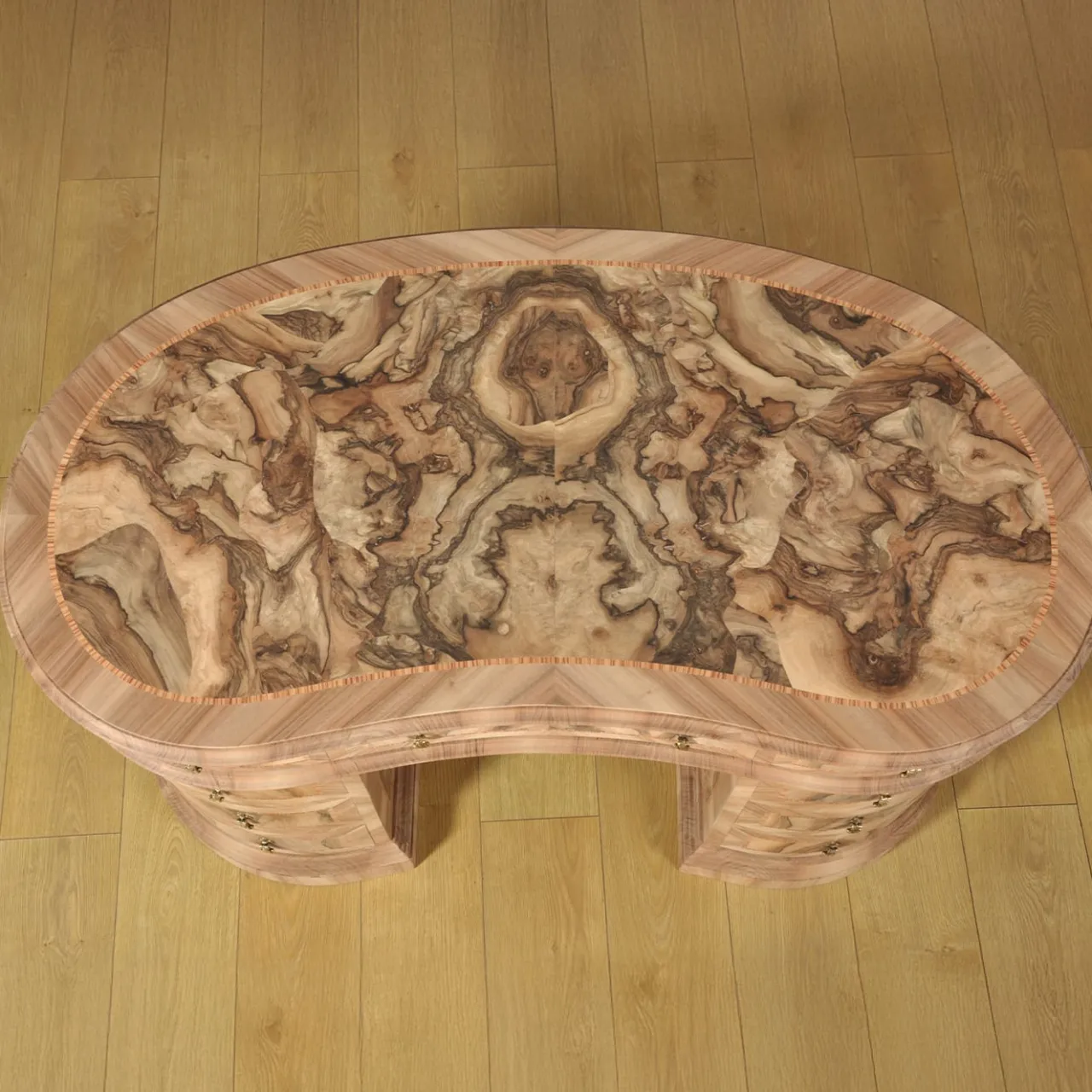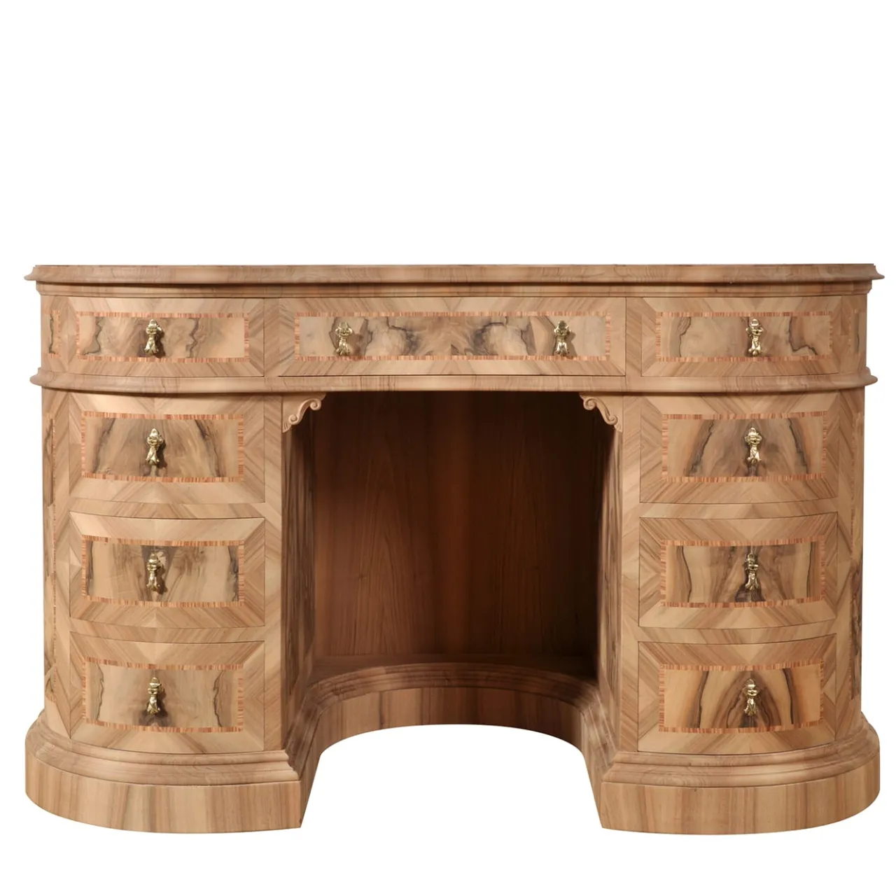 Raro e prestigioso scrittoio veneziano “a fagiolo” con nove cassetti, magistralmente intarsiati a mano in legni pregiati come il noce, il bois de rose e la rara radica di noce di Ferrara. La raffinata intarsiatura a specchio e le maniglie a pendolo in ottone massiccio, realizzate secondo le tecniche tradizionali del XVIII secolo, ne evidenziano l’eccezionale maestria. Completa di uno scomparto segreto nascosto, una riproduzione di questo capolavoro è orgogliosamente presente nella residenza ufficiale del Presidente degli Stati Uniti, la Casa Bianca.