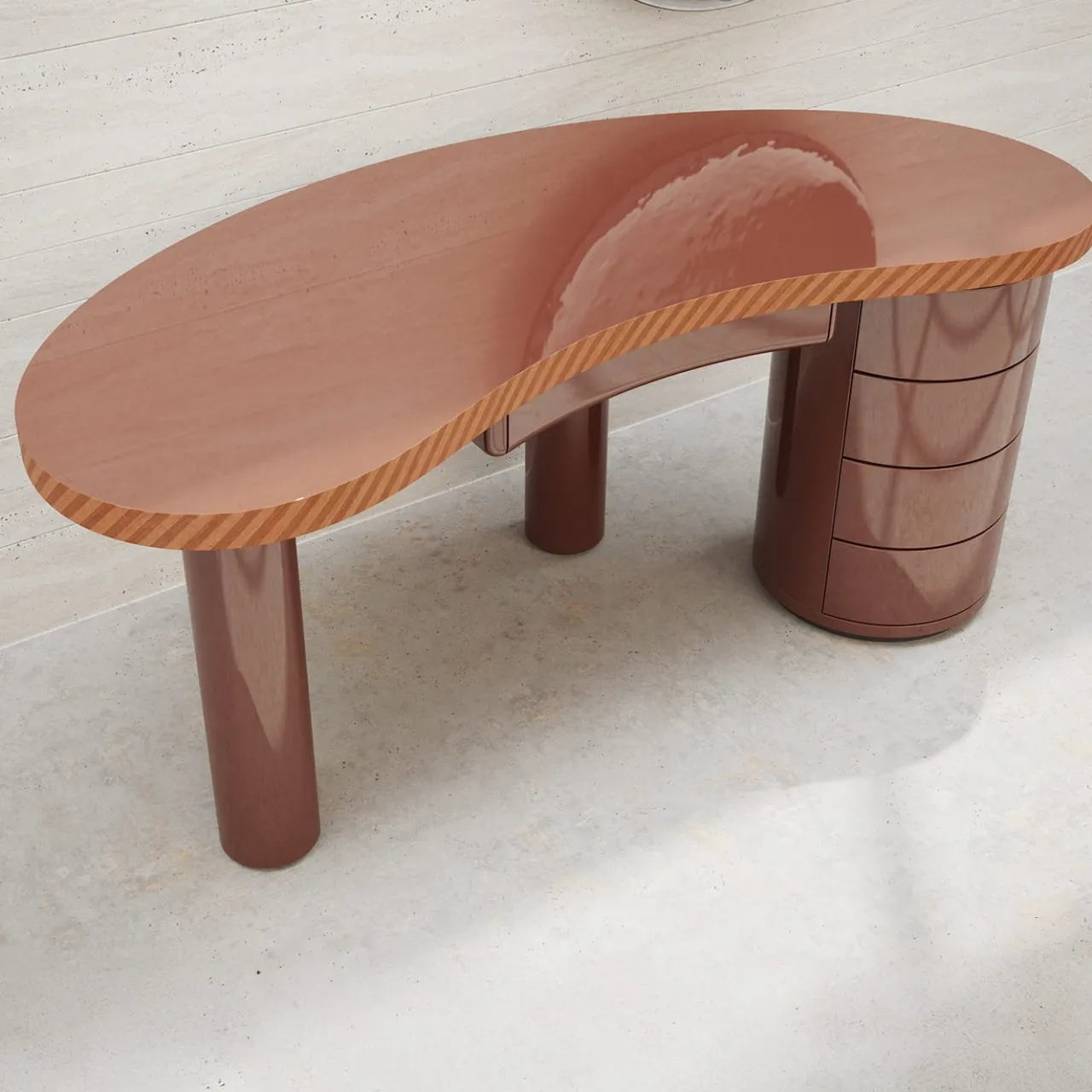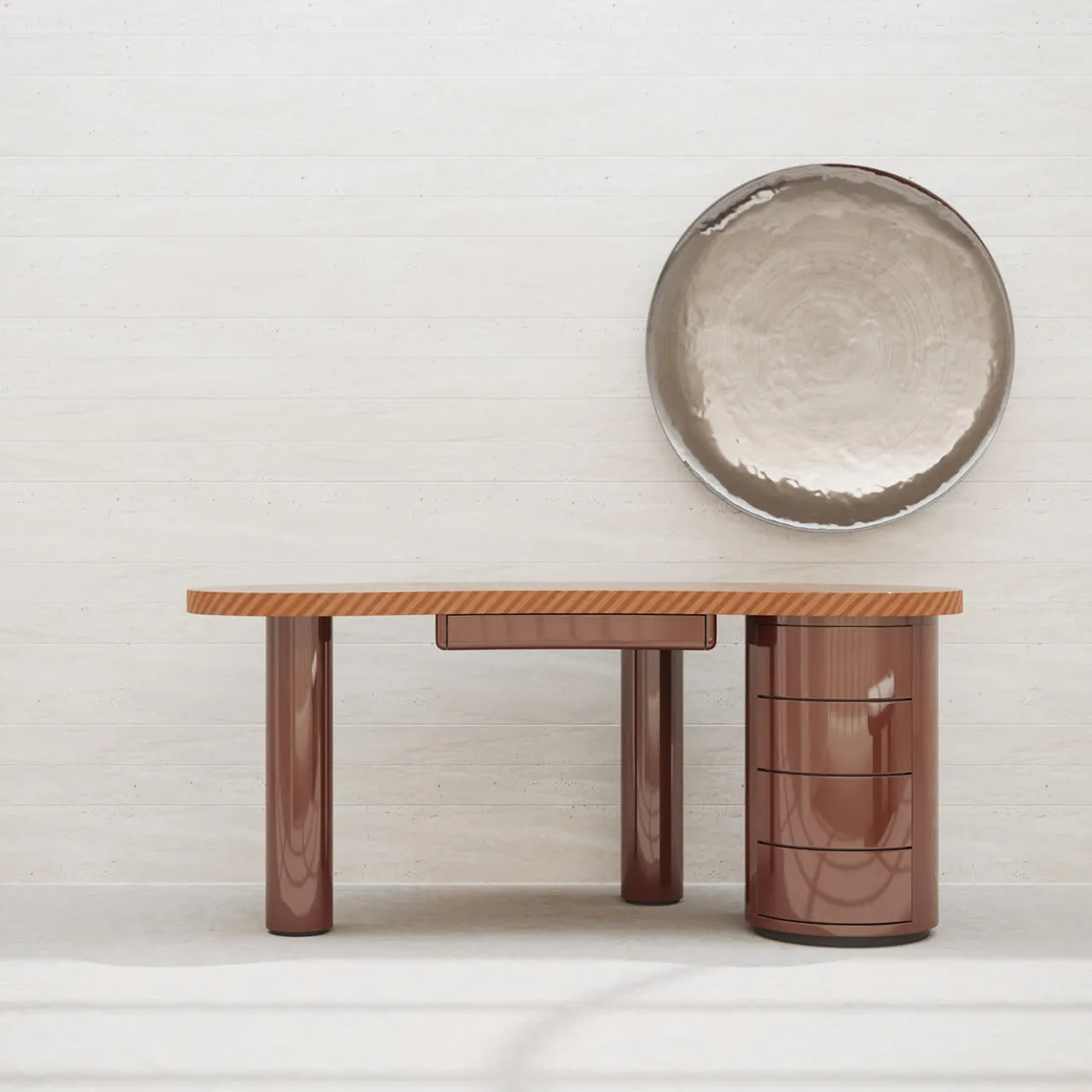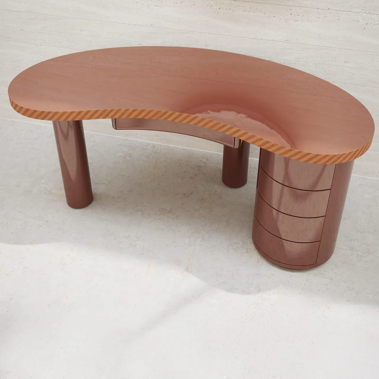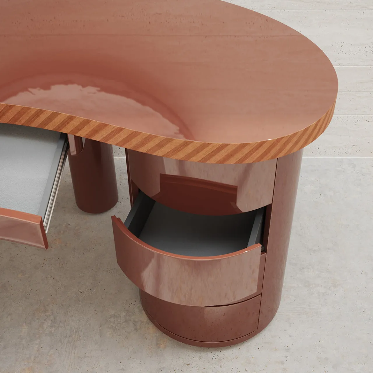 Una silhouette seducente, tracciata da curve fluide, definisce questa superba scrivania, un pezzo che sicuramente infonderà un elegante dinamismo negli uffici domestici e negli studi privati. Impreziosita da un’affascinante finitura lucida, la struttura metallica color rame è dotata di un totale di cinque cassetti per organizzare file e cancelleria. L’impiallacciatura a grana stretta MW NEWOOD adorna il piano sagomato, per un contrasto pulito e intrigante che cattura lo sguardo senza compromettere l’armonia visiva e la funzionalità che definiscono il pezzo.