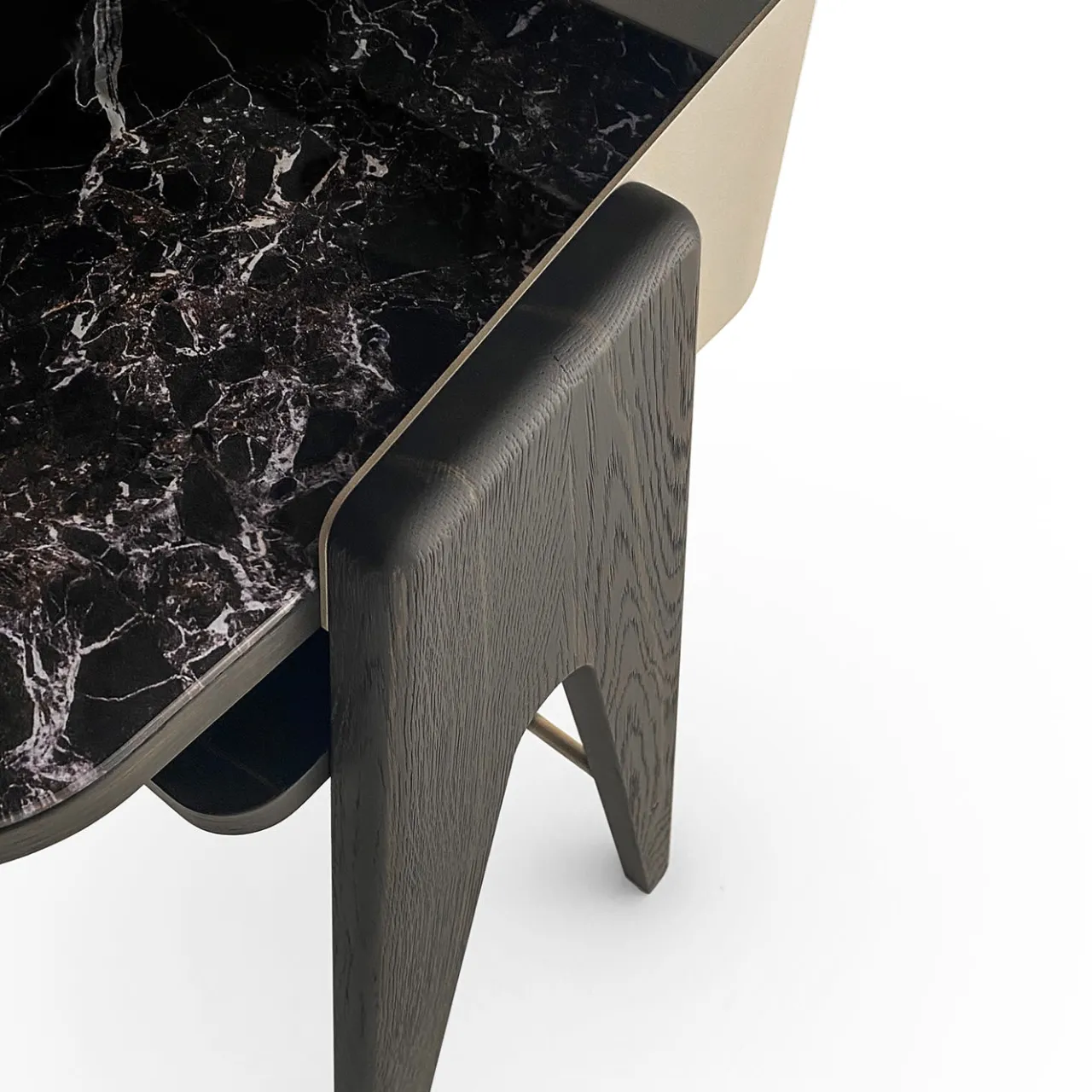 Ricco di esclusività, questo scrittoio/vanity desk è un esercizio di superbe finiture prese in prestito anche dalla natura. Il dettaglio distintivo è l’effetto marmo Breccia Imperiale del piano in vetro retrostampato, le cui tonalità si armonizzano con l’avvolgente struttura in metallo laminato color champagne e con il massello di rovere Laguna con cui sono realizzate le gambe a V. La stessa impiallacciatura di legno è utilizzata per il piano in MDF.