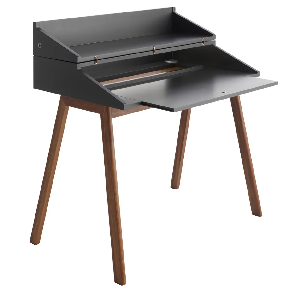 Funzionale ed elegante al tempo stesso, questo scrittoio vanta un fascino moderno e versatile. Disegnato da Esa Vesman, è realizzato in legno di noce canaletto con finitura laccata nera ed è dotato di un mobile in MDF che si chiude per tenere al sicuro gli oggetti sulla scrivania. Questa scrivania sarà un complemento unico ed essenziale per qualsiasi interno. La luce LED e il foro per i cavi sono inseriti all’interno per aggiungere un elemento funzionale.