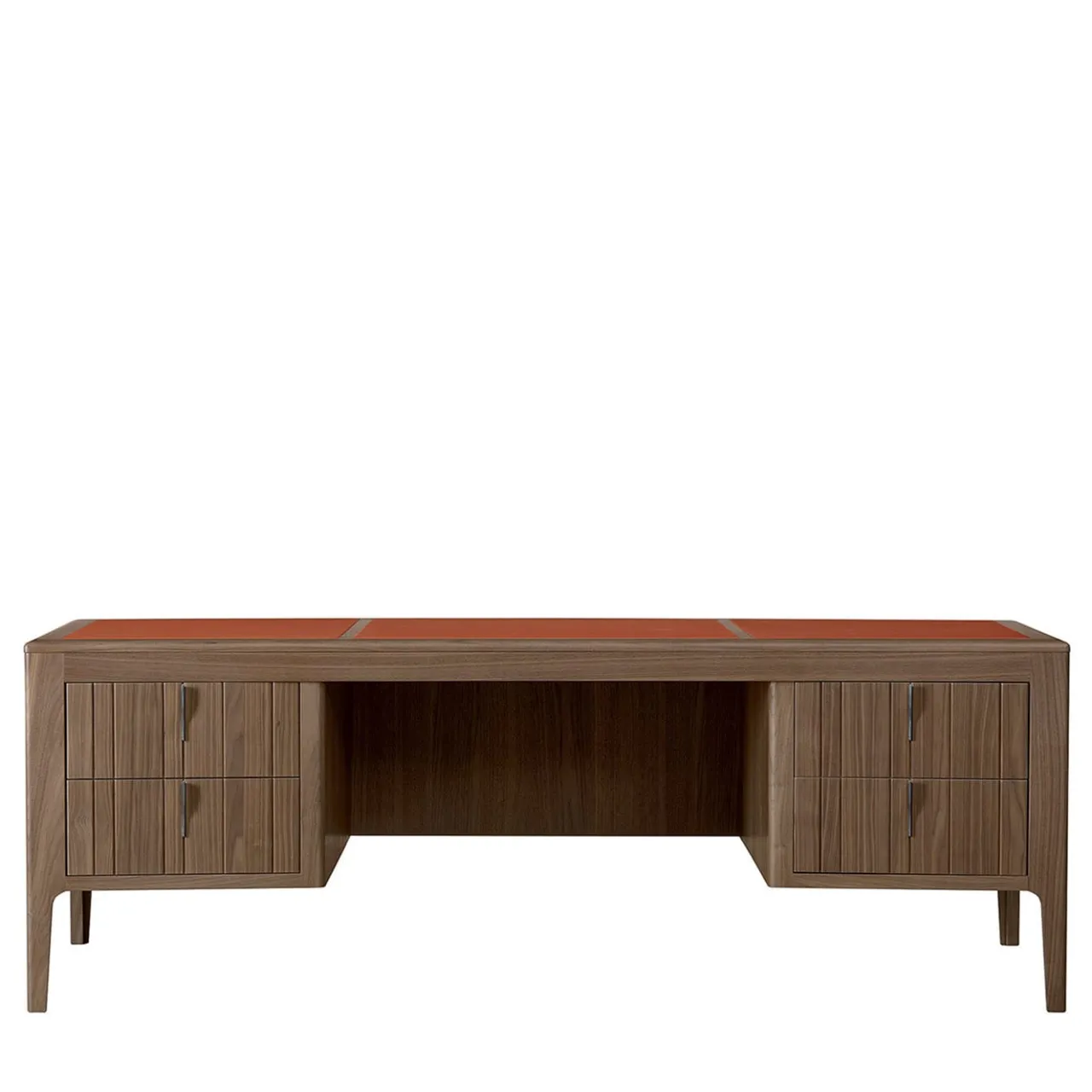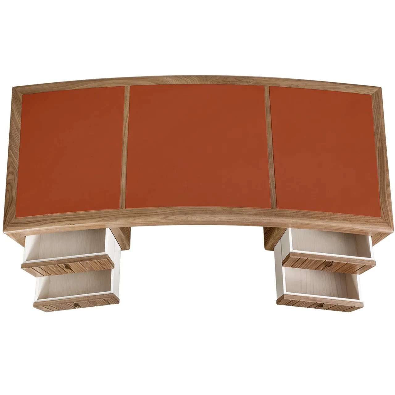 Scrittoio in versione curva con quattro cassetti in legno Canaletto Origine e piano in pelle.