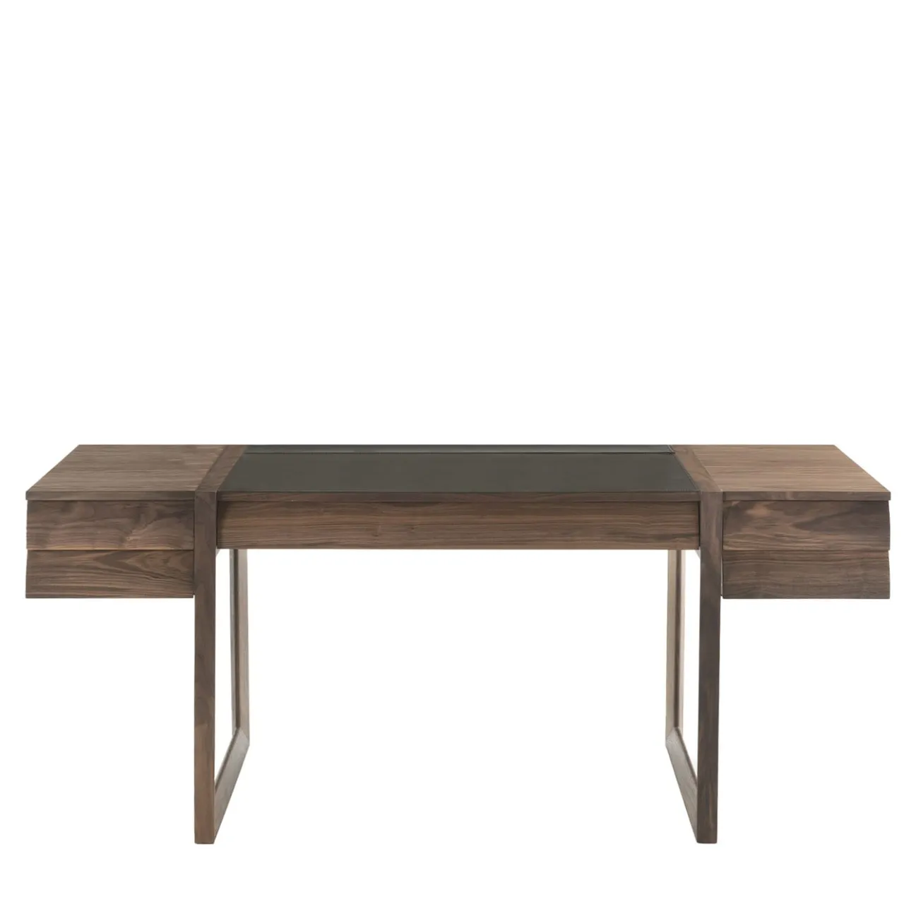 Riferimenti sartoriali e rustici convivono in questa elegante scrivania disegnata da Jamie Durie. Finita a olio, la sua struttura in noce annodato è dotata di una coppia di cassetti su entrambi i lati, che si aggiungono a quello centrale proprio sotto il piano, rivestito in pregiata pelle Olimpia di colore nero per una piacevole esperienza di scrittura. Le gambe a slitta completano la struttura.