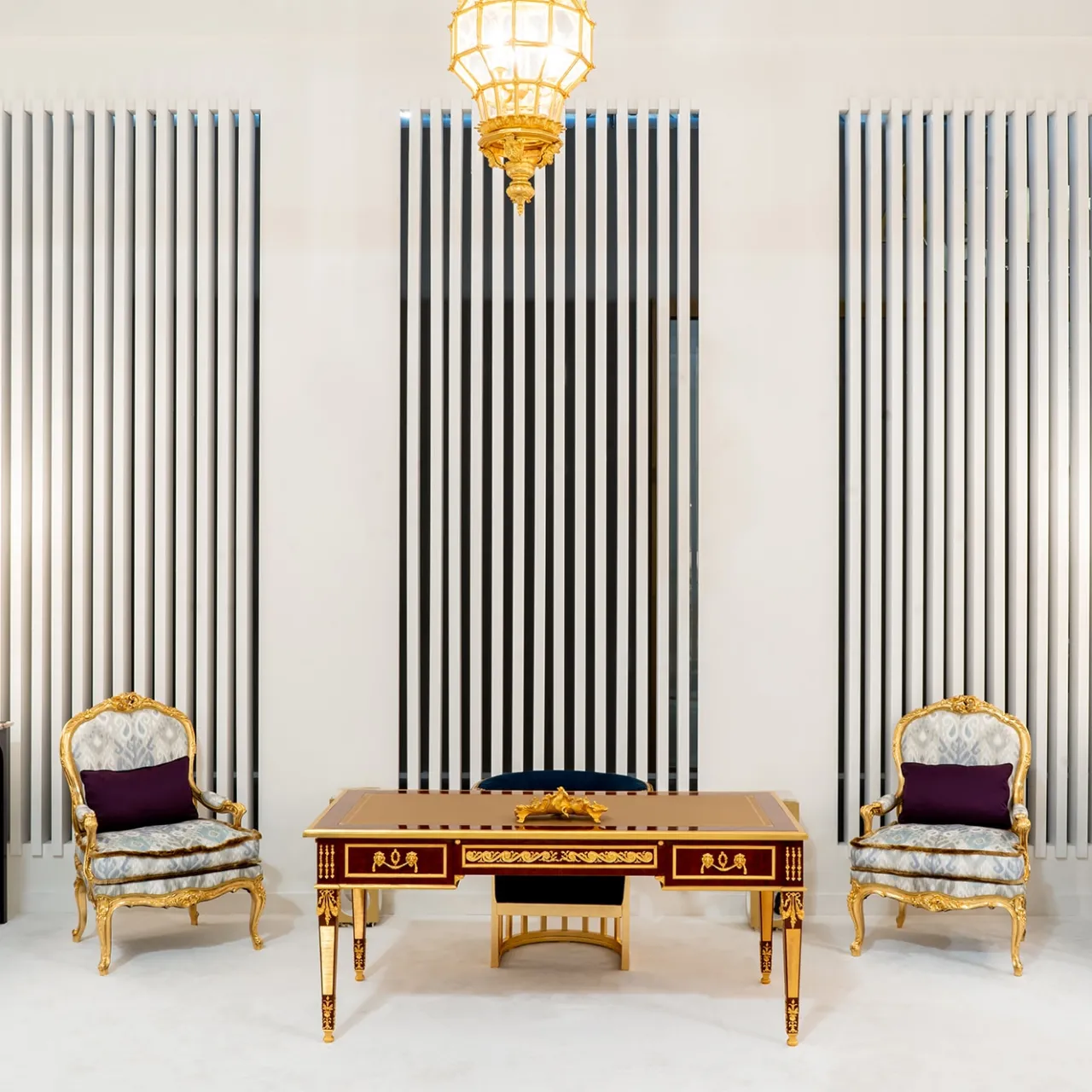 Esclusivo design in stile Luigi XVI di straordinaria raffinatezza, questo scrittoio conferirà un’allure lussuosa a un interno sofisticato. Realizzato a mano in mogano Pomele, è arricchito da decorazioni in bronzo placcate in oro 24 carati. Il piano è rivestito in pelle pregiata impreziosita da incisioni in foglia d’oro. Questo splendido design è completato da due piccoli cassetti estraibili per riporre oggetti di valore e soprammobili preziosi.