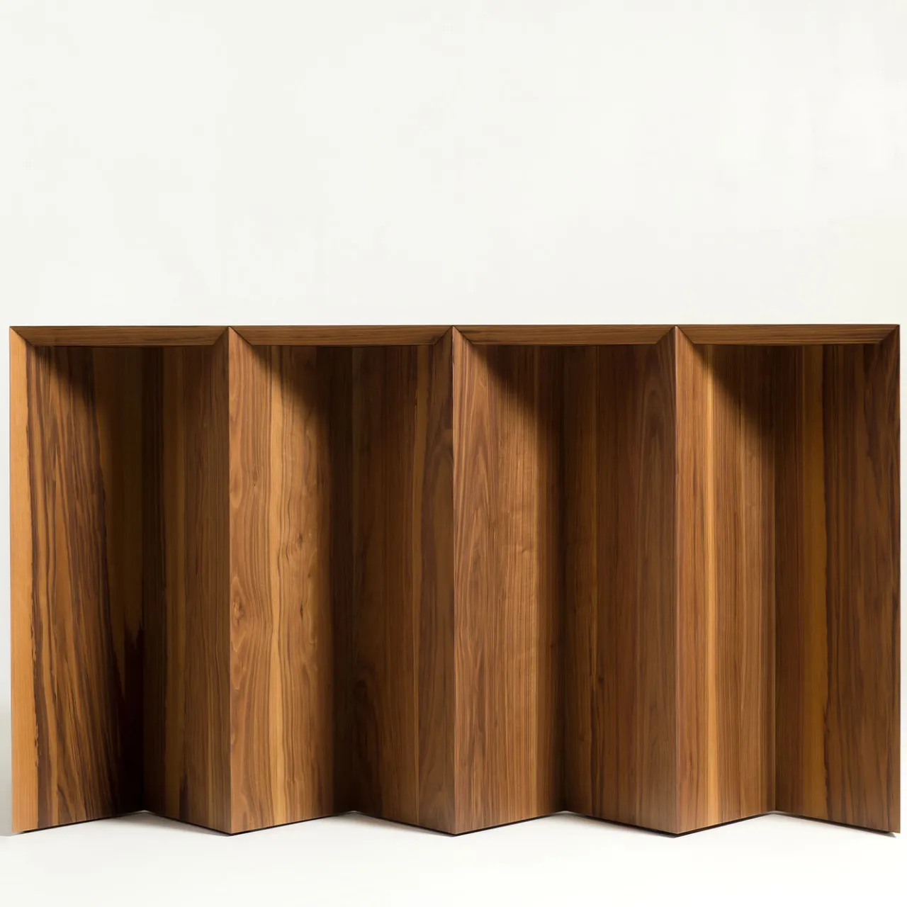 Intarsio è una scrivania in noce americano massiccio concepita come un’esplorazione pratica dell’arte del intarsio. Da un unico blocco di legno, vengono ricavati quattro sgabelli triangolari, che si incastrano come pezzi di un puzzle per rimodellare la forma della scrivania. Ogni sgabello ha tre lati visibili, ognuno con una finitura diversa—noce naturale, laccato blu e rame—creando composizioni visive mutevoli a seconda della loro orientazione. Il piano ultra-sottile mette in evidenza la forza del legno massiccio come elemento compositivo. Due cassetti con interni laccati blu e un compartimento nascosto con prese elettriche completano questo pezzo modulare e scultoreo progettato per trasformare l’ambiente abitativo.
