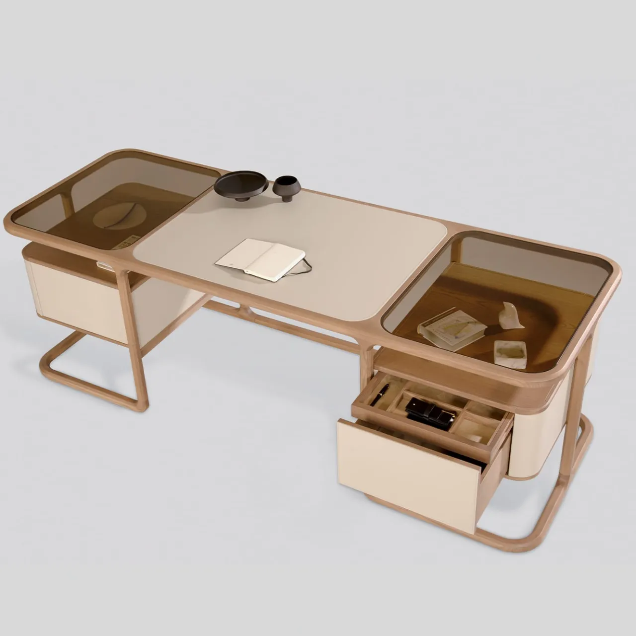 Il design minimale e l’estrema versatilità di questa raffinata scrivania bifacciale di Libero Rutilo sono ideali per gli spazi abitativi di piccole dimensioni che richiedono due postazioni di lavoro. Realizzata in frassino tornito per una silhouette sinuosa, presenta due piani laterali in vetro e uno centrale a scomparsa. Ogni lato è dotato di cassetti laterali a scomparsa e di due vani portaoggetti segreti. Misure 226x80x75cm.