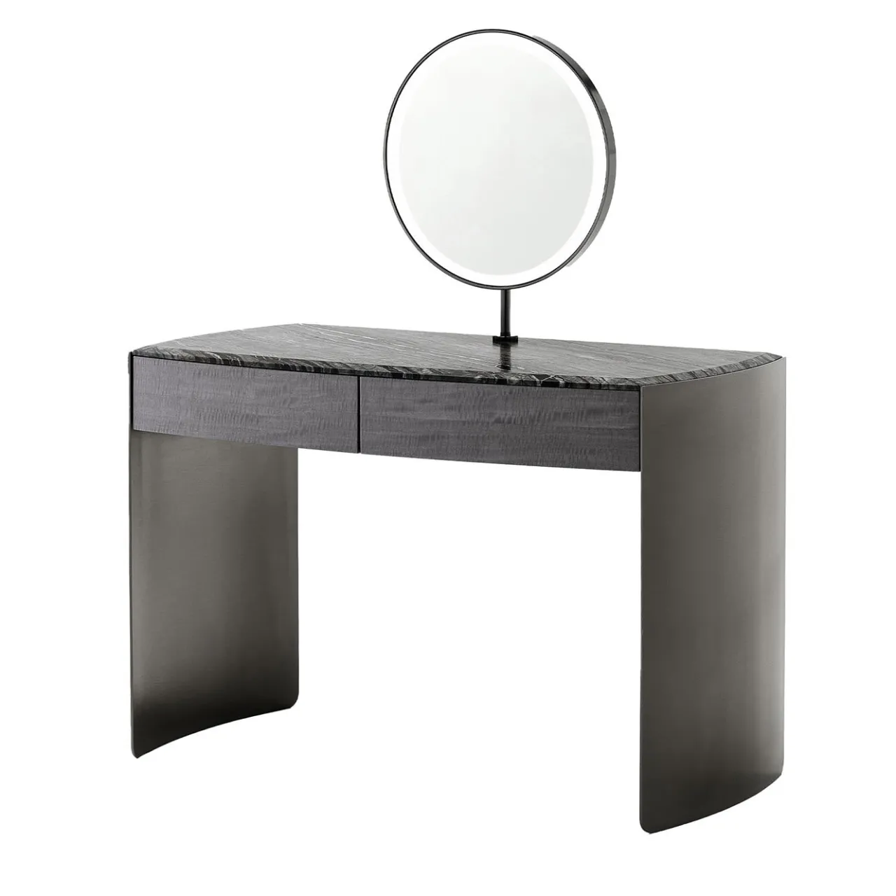 Questo scrittoio per vanità, che si aggiunge ai raffinati arredi della camera da letto, combina magistralmente materiali e finiture di pregio. I pannelli curvi rifiniti in acciaio inox satinato nichel nero offrono un sostegno impeccabile, completato da un sorprendente piano in marmo nero del Kenya e da due cassetti a estrazione totale in impiallacciatura di Mowinghi figurato del Madagascar il cui fondo è rivestito in velluto.