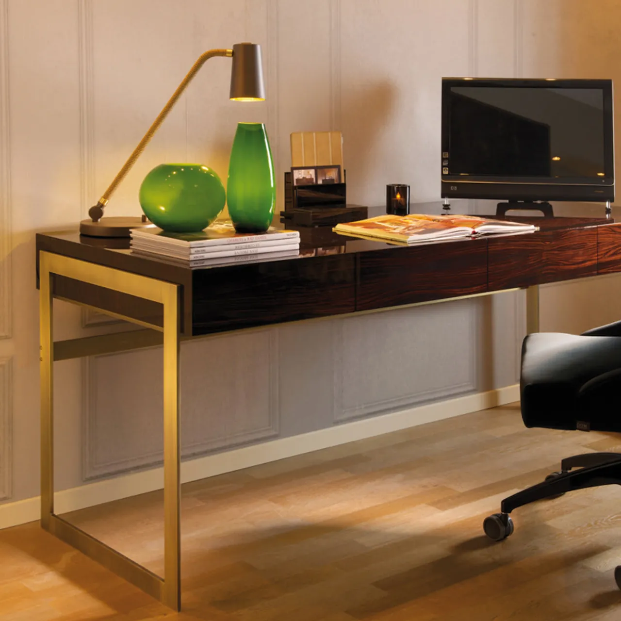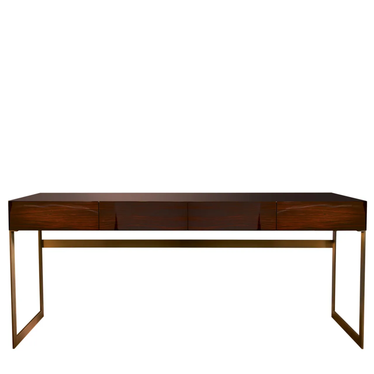 Realizzata magistralmente a mano da esperti artigiani, questa scrivania combina materiali lussuosi con un’estetica di design minimalista che aggiungerà un’eleganza senza tempo a qualsiasi casa o ufficio. Evocando una sensazione di leggerezza visiva, il piano rettangolare in legno di ebano Macassar sembra fluttuare tra i due quadrati di metallo ottonato che fungono da gambe, collegati nella parte posteriore con una barra dritta per una maggiore stabilità. Il piano (15 cm di altezza) è dotato di due cassetti laterali con interni a specchio e di un’ampia superficie per computer, lampade e altri accessori da scrivania. Si abbina perfettamente a qualsiasi sedia DOM Edizioni.