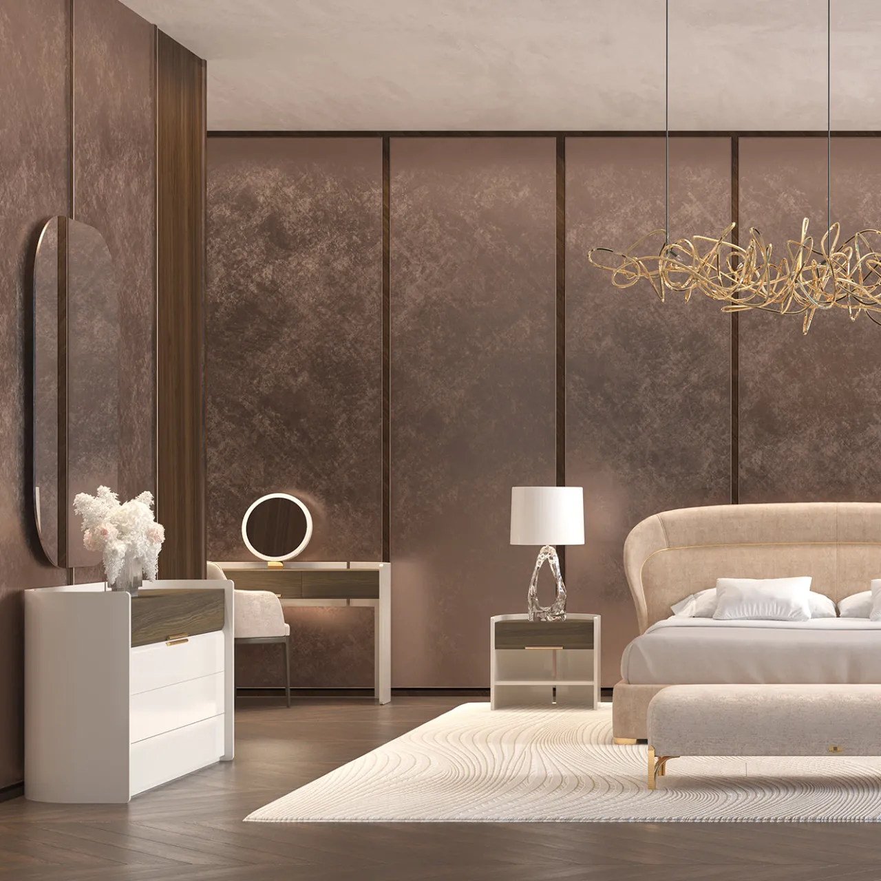 Raffinata scrivania da toeletta con ampio cassetto, caratterizzata da una finitura in legno scuro che contrasta armoniosamente con la struttura laccata color avorio, dalla superficie liscia e lucida. Lo specchio rotondo integrato è impreziosito da un’illuminazione LED soffusa, che diffonde un bagliore delicato, perfetto per le routine di bellezza quotidiane. L’equilibrio tra funzionalità e atmosfera rende questo arredo un elemento pratico ed elegante, ideale per spazi dressing dal gusto contemporaneo.