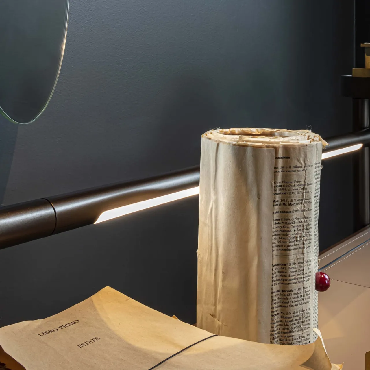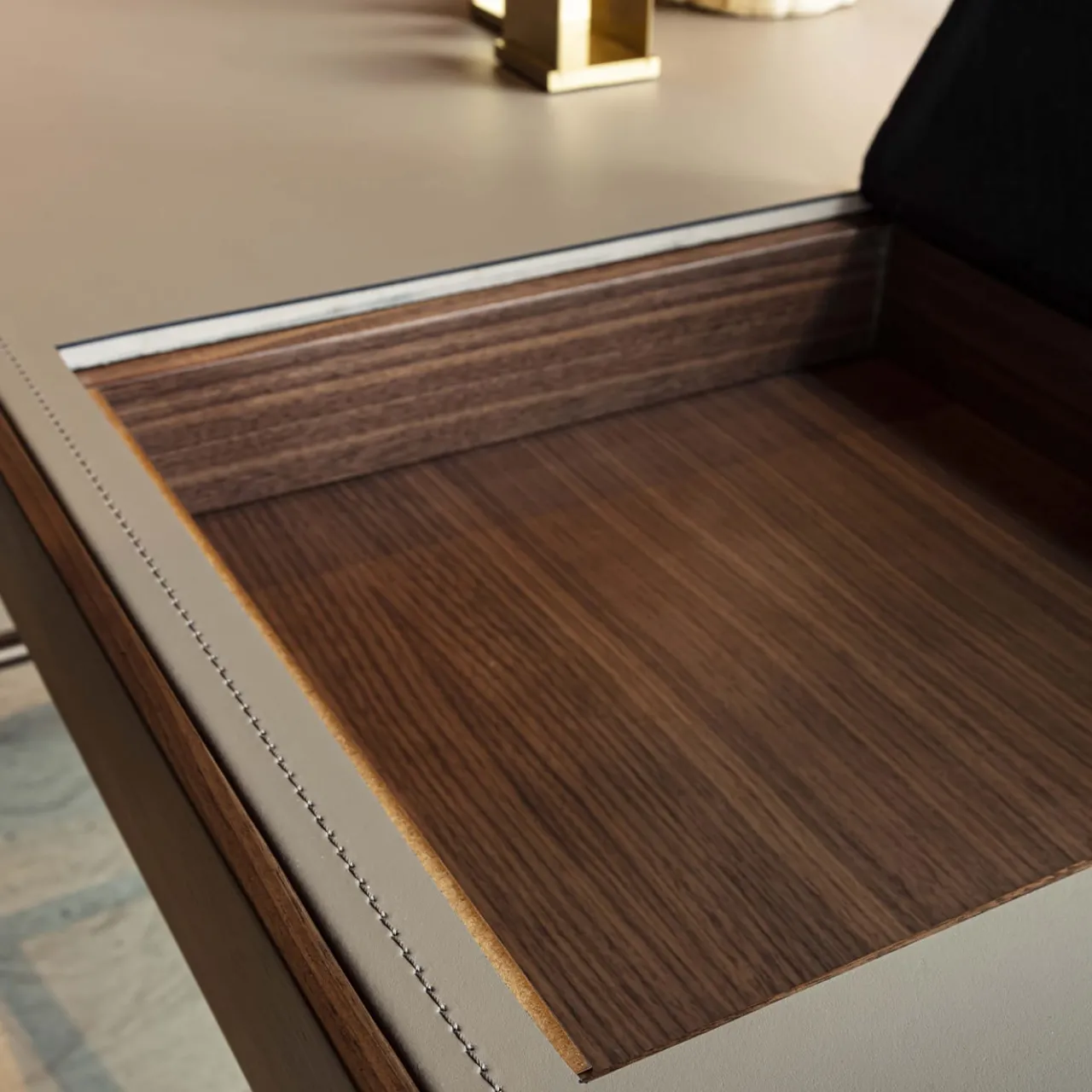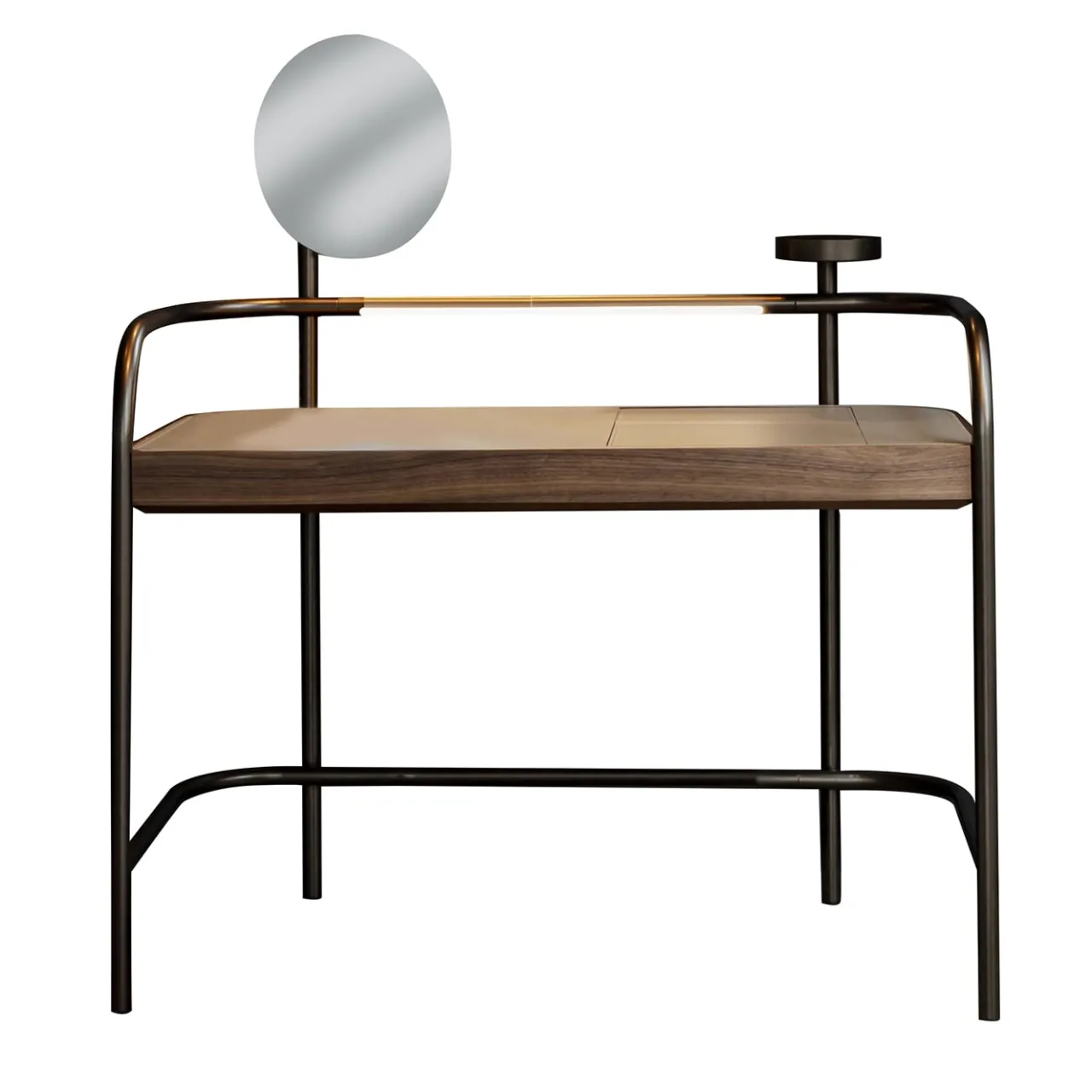 Scrivania con struttura tubolare in metallo e piano in legno rivestito in pelle. Accessori: specchio, portagioie, vano portaoggetti a destra del piano e luce LED con controllo a sensore. Esiste una versione standard e una versione connessa, con prese di corrente e caricatore wireless per gli smartphone abilitati. Tutti i componenti sono disponibili in altri colori. Per maggiori informazioni, contattare il concierge.