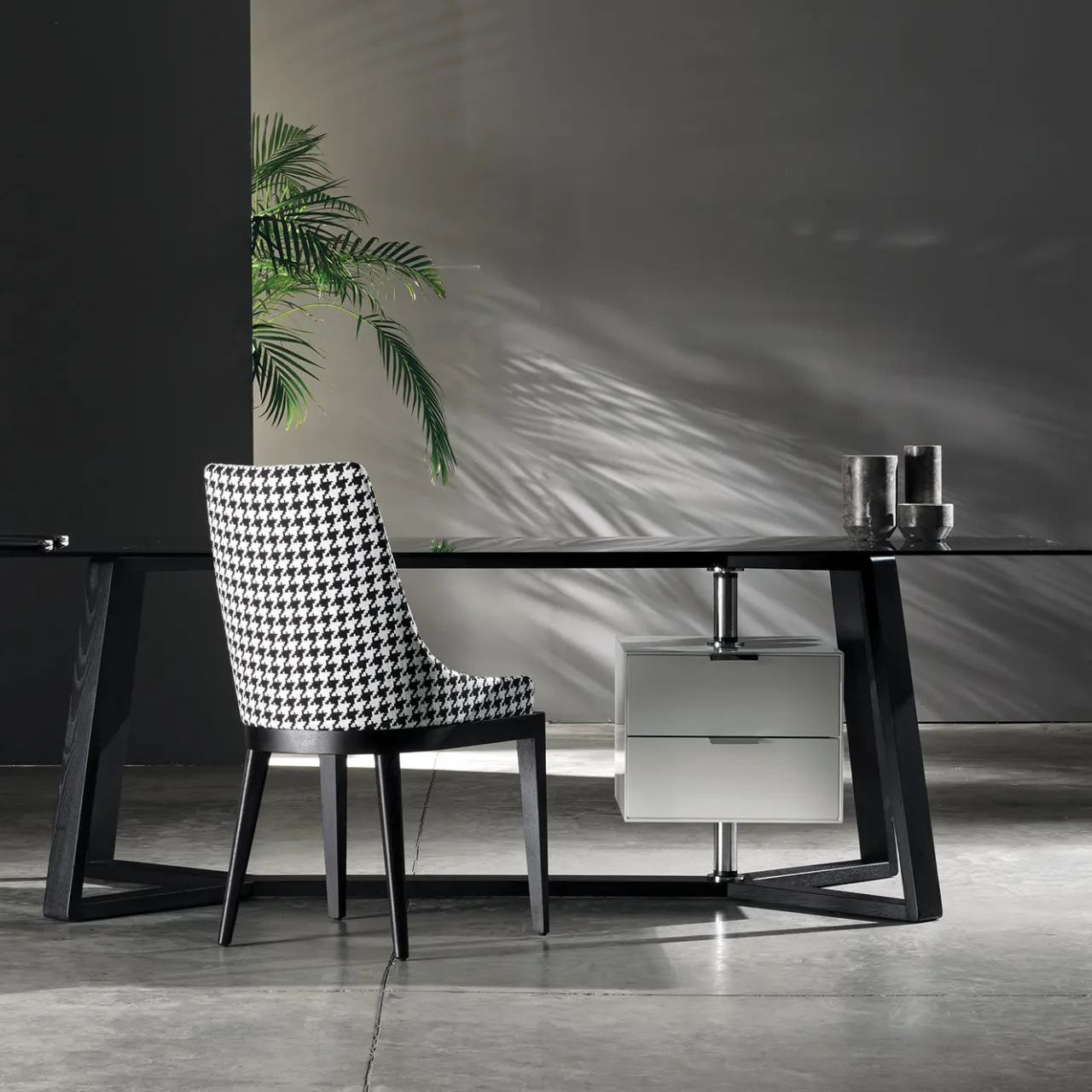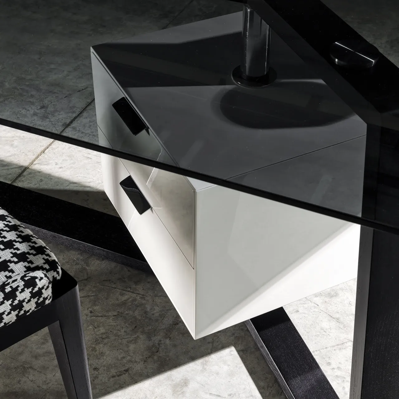 Questo superbo oggetto di arredamento funzionale è un capolavoro scultoreo con gambe di forte impatto visivo in frassino tinto nero, che creano una forma a Y alla base. Il piano è in vetro fumé. L’aggiunta di due cassetti su un lato aggiunge un accento suggestivo, spostando l’equilibrio di questo pezzo. I cassetti sono rifiniti in lacca bianca lucida e fissati al piano e alla base con metallo cromato.