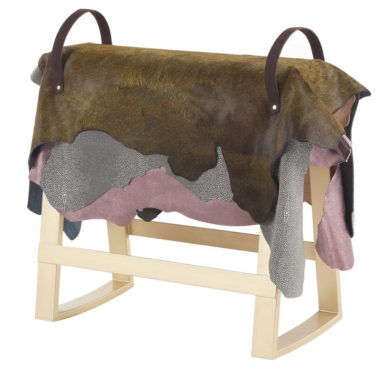 Sgabello a dondolo con struttura in metallo in finitura oro opaco. Seduta con struttura in legno multistrato e poliuretano espanso ad alta densità. Rivestimento con tre diversi strati di pelle nabuk: pelle verde Horsy, pelle anilina marrone metallizzata e pelle verde-ray. Maniglie in pelle nabuk marrone con bottone in ottone. Dettagli della variante: Sgabello a dondolo con struttura in metallo con finitura oro opaco o cromo nero. Seduta con struttura in legno multistrato e poliuretano espanso ad alta densità. Rivestimento in tre diversi strati di pelle. Maniglie in pelle con bottone in ottone.