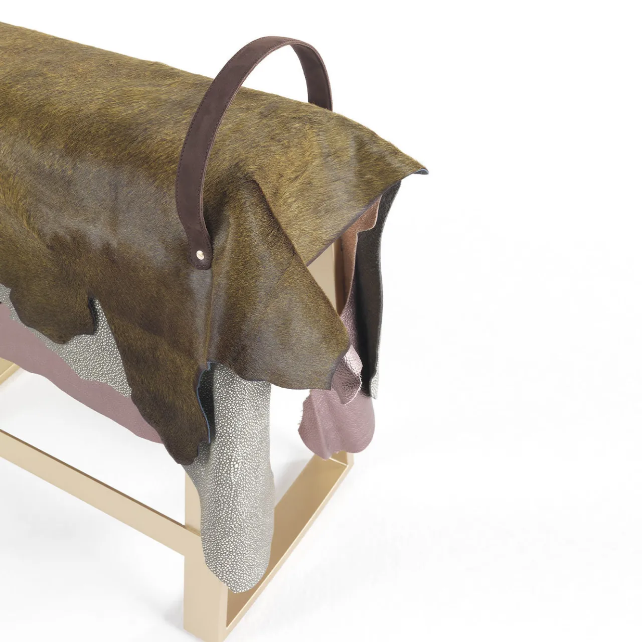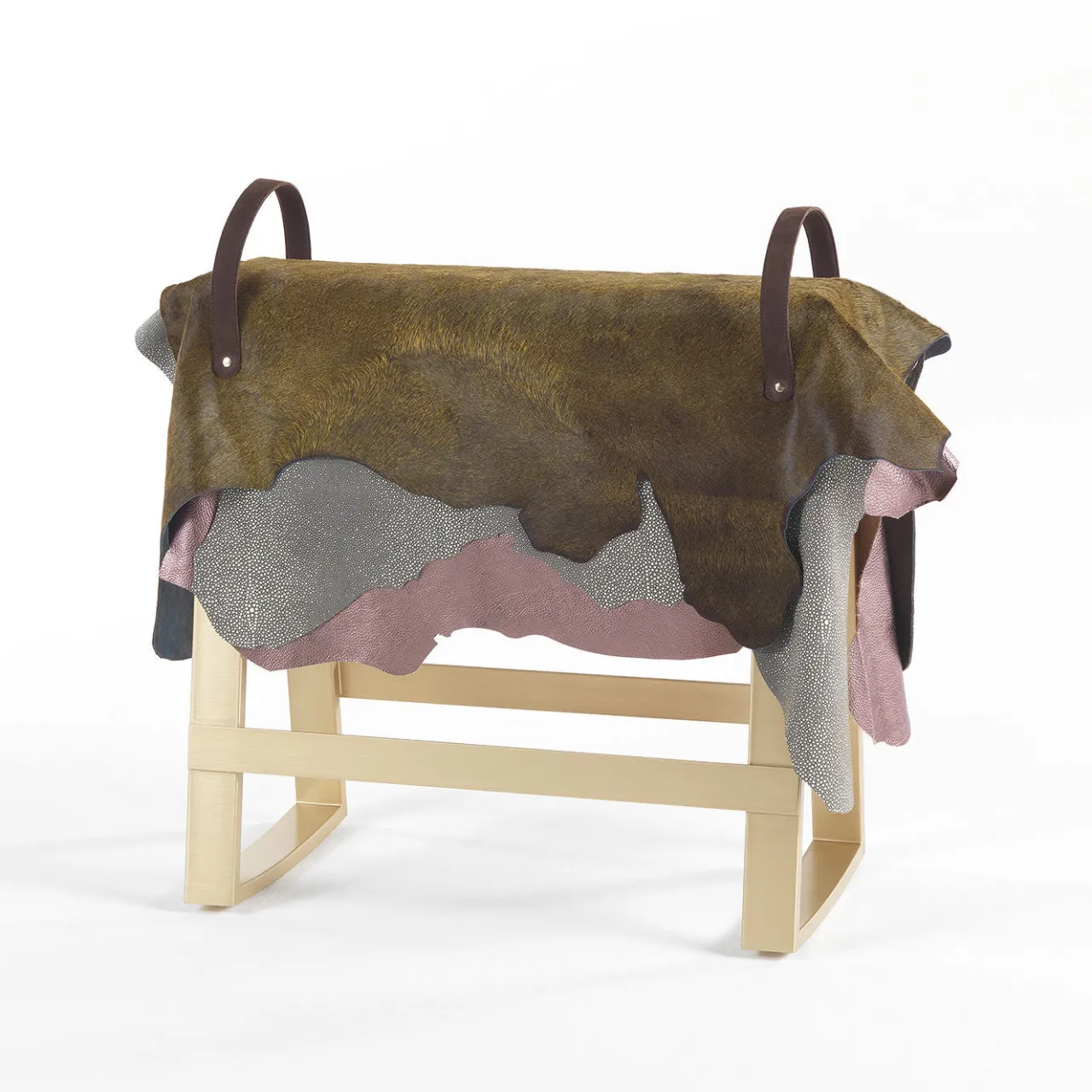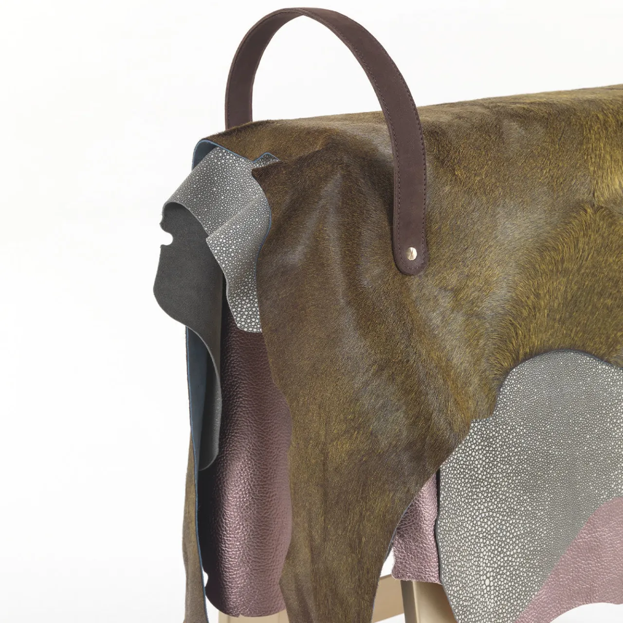 “Il potere creativo dell’uomo e la bellezza della natura: un binomio in costante ricerca di equilibrio, che trova la sua perfetta espressione in Agaxa. I molteplici strati di pelle che ricoprono la struttura metallica trasformano lo sgabello in una creazione potente, sfumando il confine tra arte e design.”