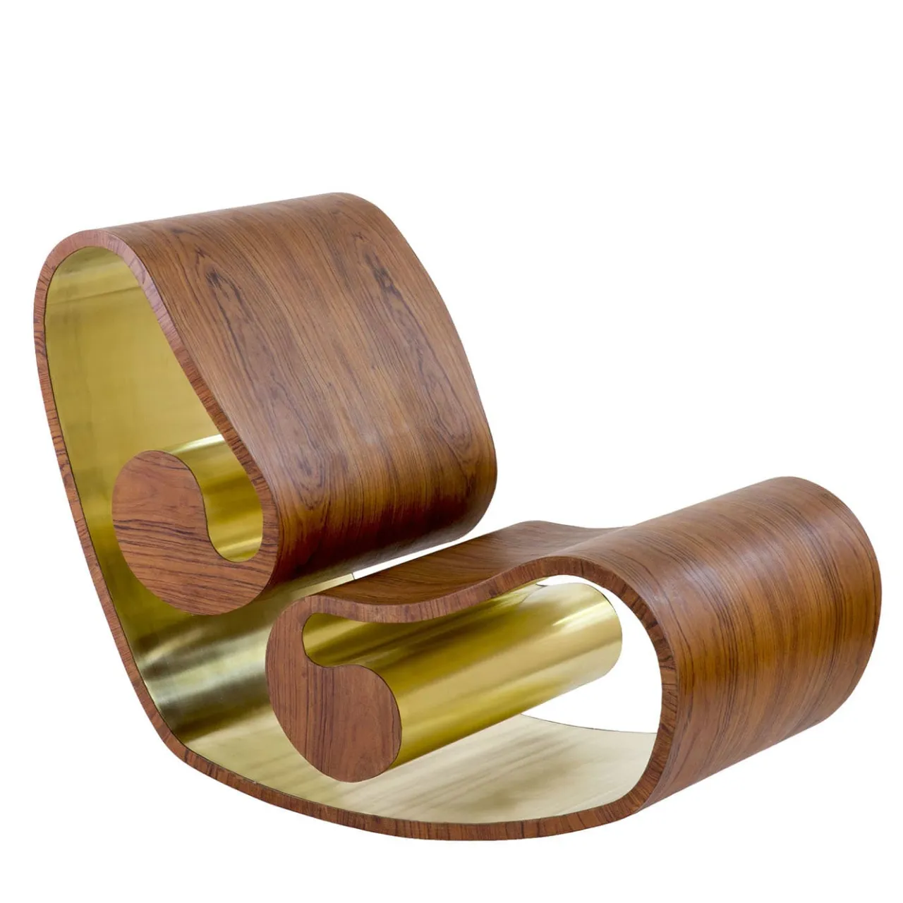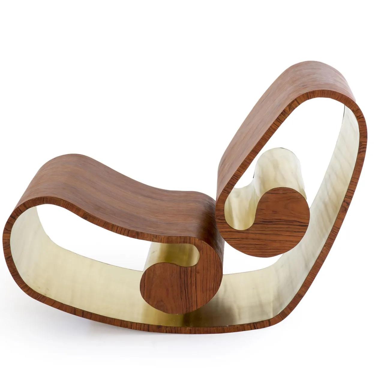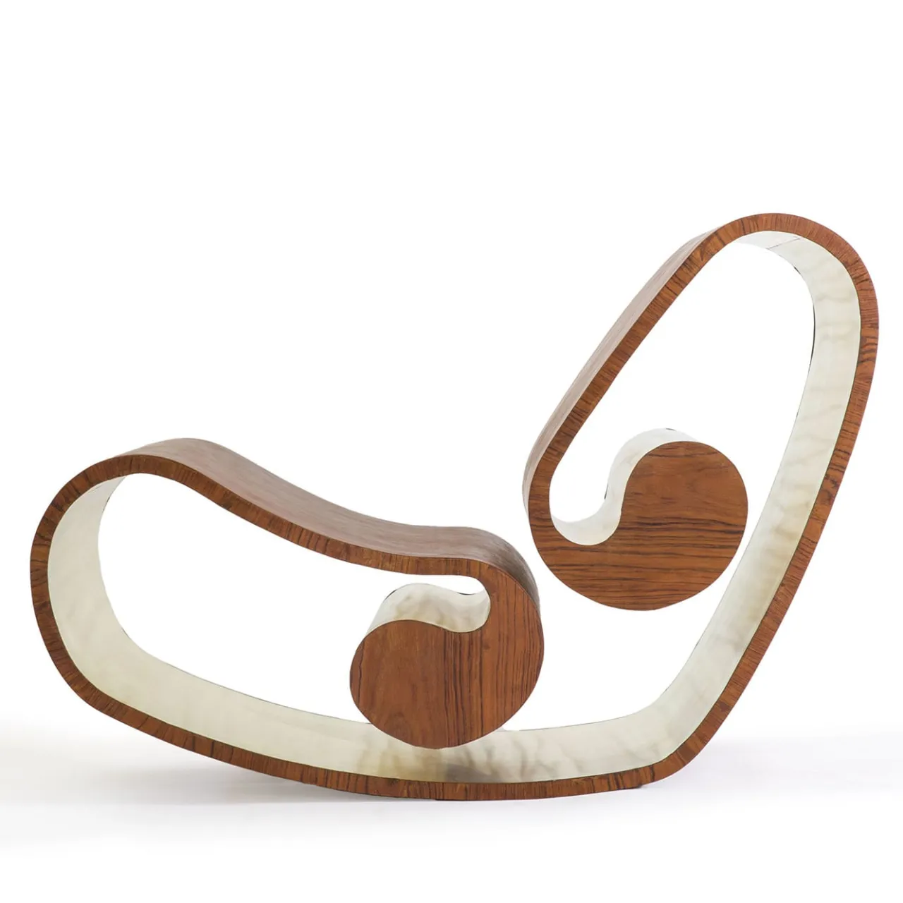 La sedia a dondolo “VOLUTA”, disegnata da Stefano Marolla, fa parte di un’edizione limitata, realizzata in legno, fibra di carbonio e ottone, si ispira alle classiche forme plastiche organiche, nascondendo dietro la sua semplice struttura, la complessa tecnologia necessaria per ottenere l’effetto elastico che ne esalta il comfort.