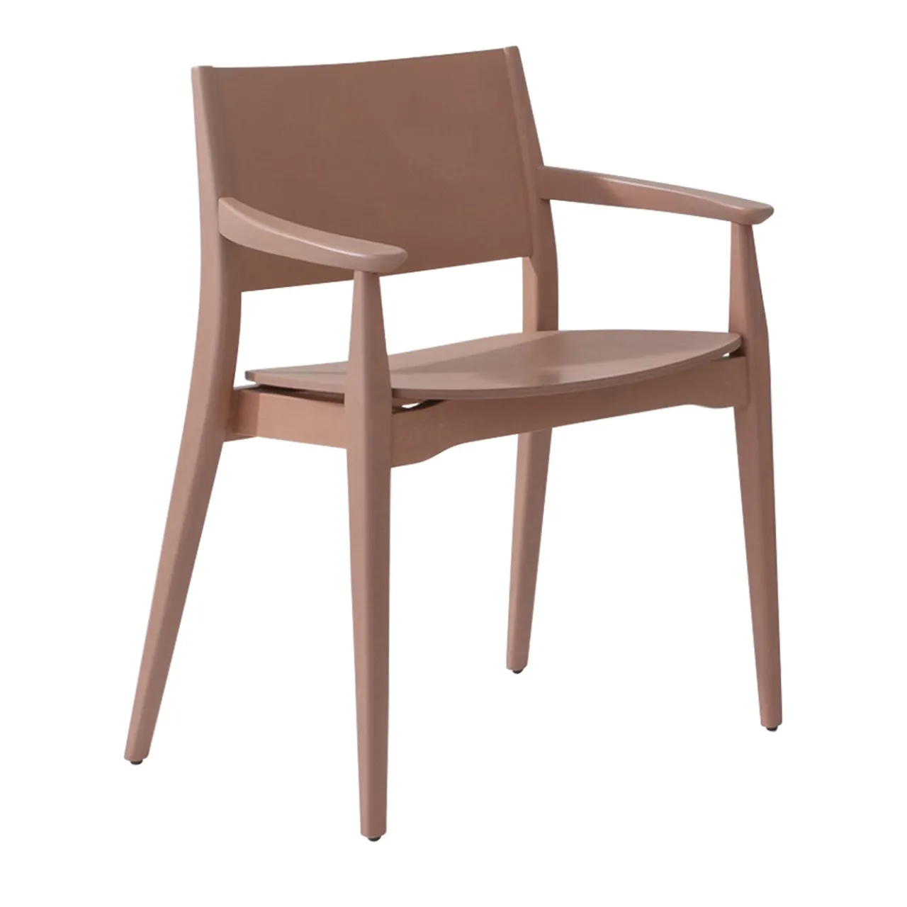 Questa raffinata sedia è il risultato di una collaborazione di successo con il designer Emilio Nanni. La robusta struttura è realizzata in faggio color salmone e sfoggia una silhouette rigorosa che comprende gambe affusolate, schienale rettangolare aperto, braccioli dritti e un sedile liscio (altezza 62 cm) leggermente inclinato all’indietro per offrire un ottimo comfort.
