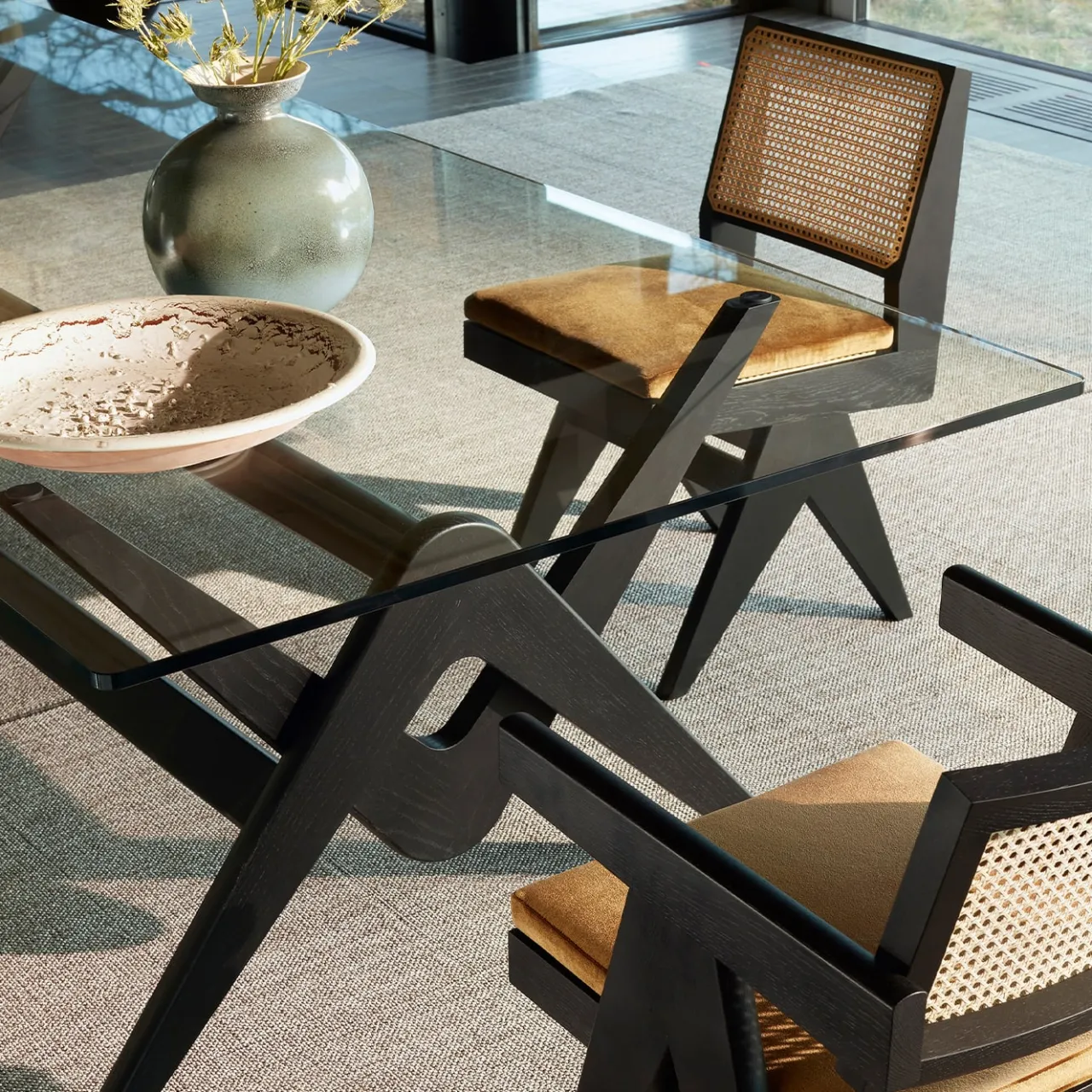 Capitol Complex, Hommage à Pierre Jeanneret – Sedia, seduta e schienale in paglia di Vienna, struttura in legno massiccio, tinta rovere nero. Questa sedia è una delle più riconoscibili del Capitol Complex di Chandigarh, presente in tutti gli uffici del Segretariato. I pezzi indipendenti, comprese le barre laterali a “V” rovesciata che sostengono i braccioli, sono tutti in legno massiccio. Lo schienale e la seduta intrecciati, tesi su un telaio di legno, sono elementi comuni nella zona, così come l’uso di legni locali come il teak. Simile alla più nota sedia da ufficio, anche questa sedia senza braccioli utilizza l’approccio a “V” per le barre laterali, in questo caso più corte in quanto non si estendono ai braccioli. L’importanza è invece data alla sequenza seduta/schienale in canna viennese intrecciata, collegata con un’immensa sezione geometrica sostenuta da due profili in legno, e alle gambe complanari, che insieme risultano semplici e allo stesso tempo potenti. La riedizione di Cassina offre la versione classica in teak e due versioni in rovere naturale e tinto nero.