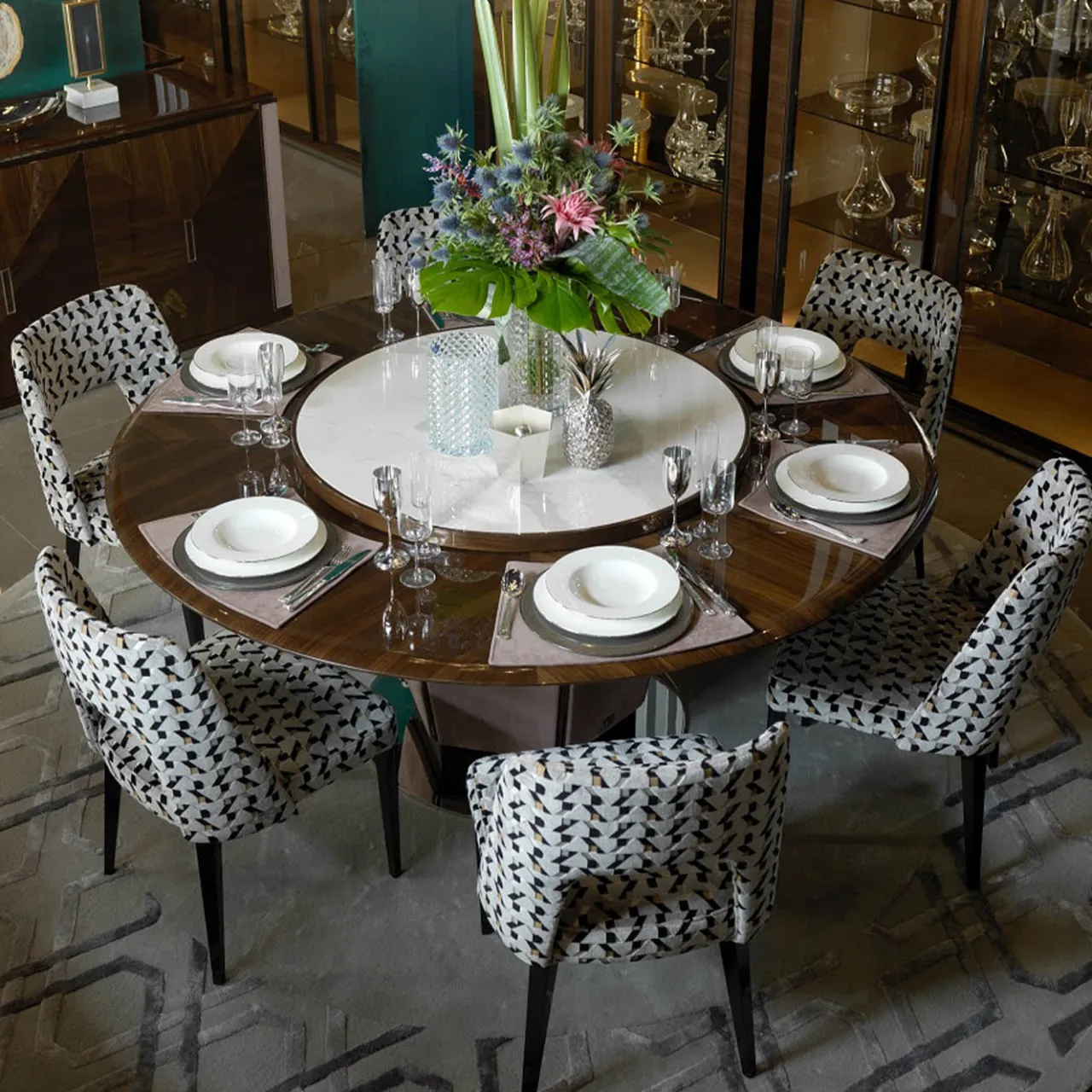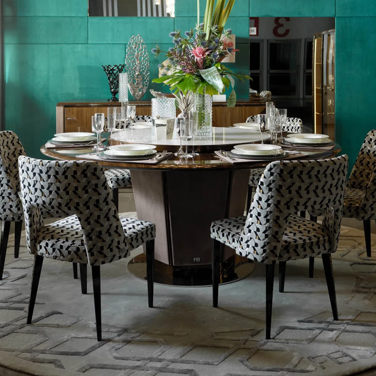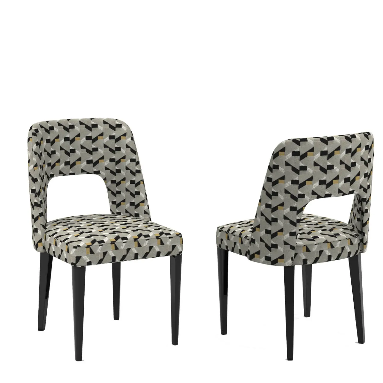 Questa esclusiva poltrona fonde audaci influenze vintage con eleganti profili moderni. Il motivo policromo di ispirazione geometrica che adorna il suo rivestimento in tessuto – Casamance Kokedera 0696 – le conferisce un’allure davvero elegante. Il design ergonomico dello schienale, con scocca leggermente avvolgente e foro lombare, assicura il massimo comfort. La laccatura nera opaca perfeziona le quattro gambe affusolate in legno.