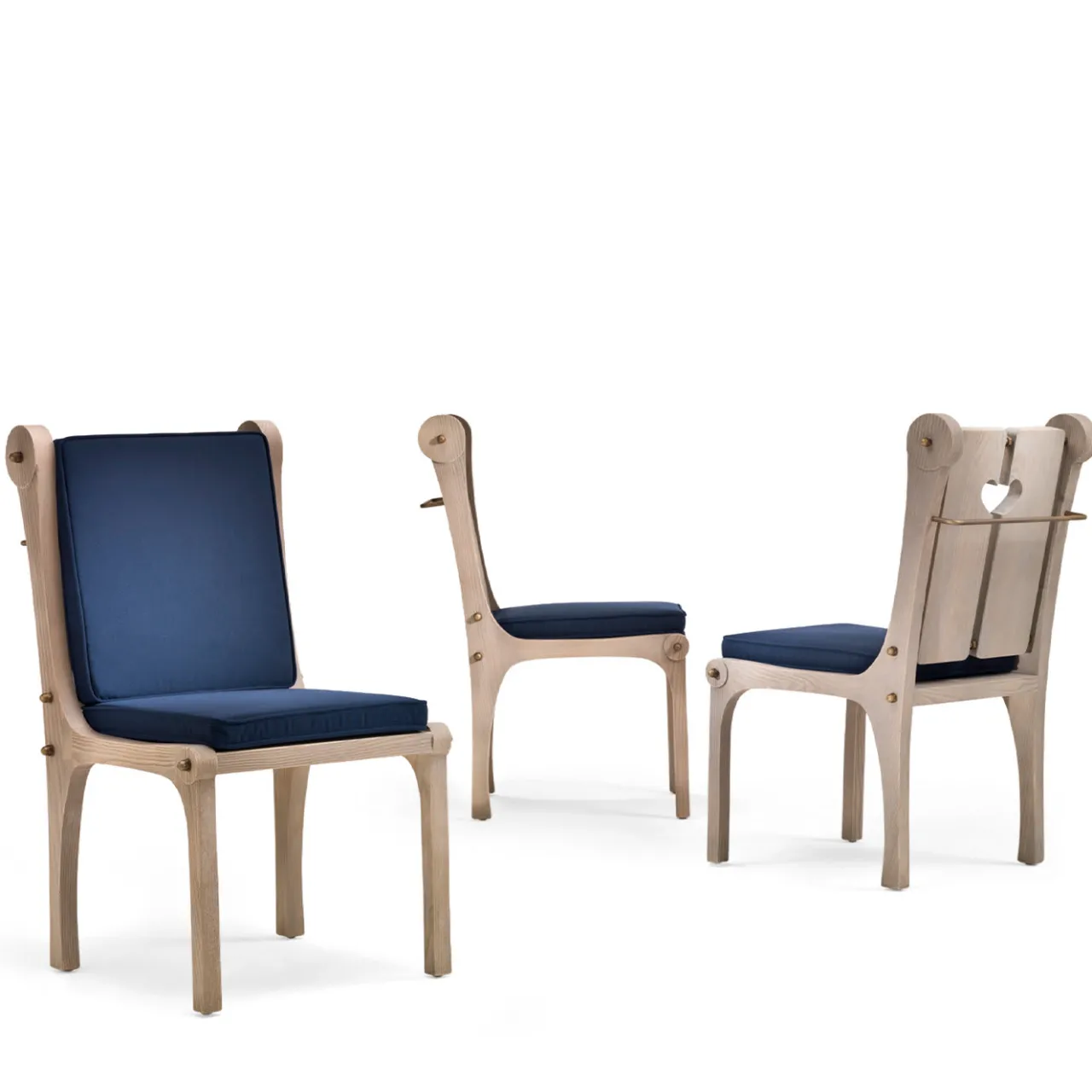 Richiamando il tradizionale stile alpino, questa sedia sarà un’elegante aggiunta all’arredamento rustico-chic, a uno chalet di montagna o a un ambiente eclettico interno o esterno. Realizzata a mano in sassofrasso americano, è caratterizzata da un design pulito di influenza nordica, in particolare dalla decorazione a forma di cuore che caratterizza lo schienale. Caratterizzato da tonalità chiare e naturali del legno, è arricchito da dettagli in metallo bronzato e ottone. Un cuscino rivestito in tessuto blu è sostenuto da un’asta metallica posteriore. Adatto anche per l’esterno.