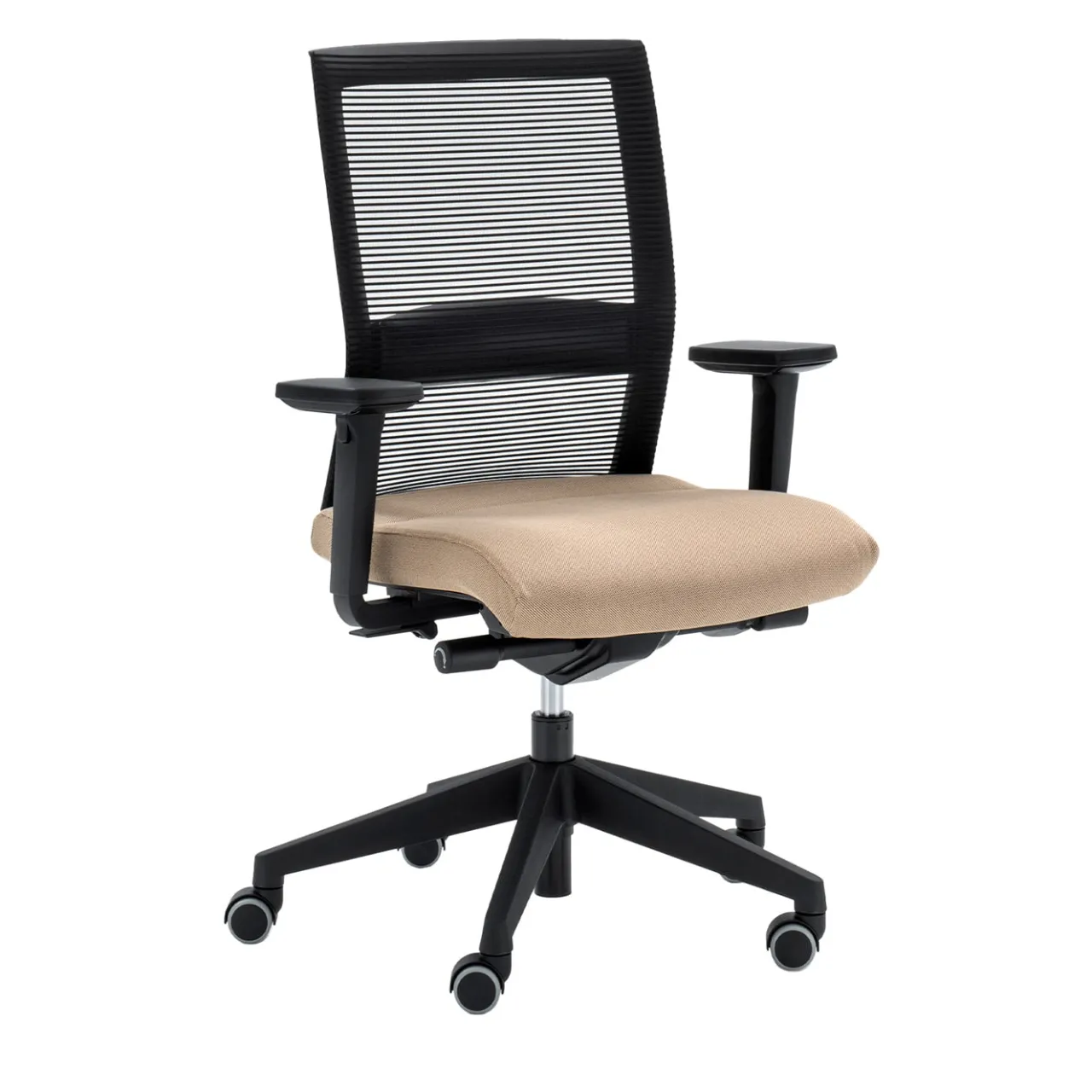 Winner è una famiglia di sedute trasversali, in grado di offrire una soluzione per tutti gli ambienti di lavoro. Poltrona operativa con schienale in rete nera, completo di supporto lombare regolabile in altezza, sedile imbottito, meccanismo synchron Top con sedile regolabile in profondità, alzata a gas, braccioli regolabili 4D (altezza, larghezza, profondità, girevoli), base a 5 razze in nylon nero con ruote gommate autofrenanti. Sedile rivestito in tessuto ignifugo beige. Chiedete al Concierge le opzioni di personalizzazione.