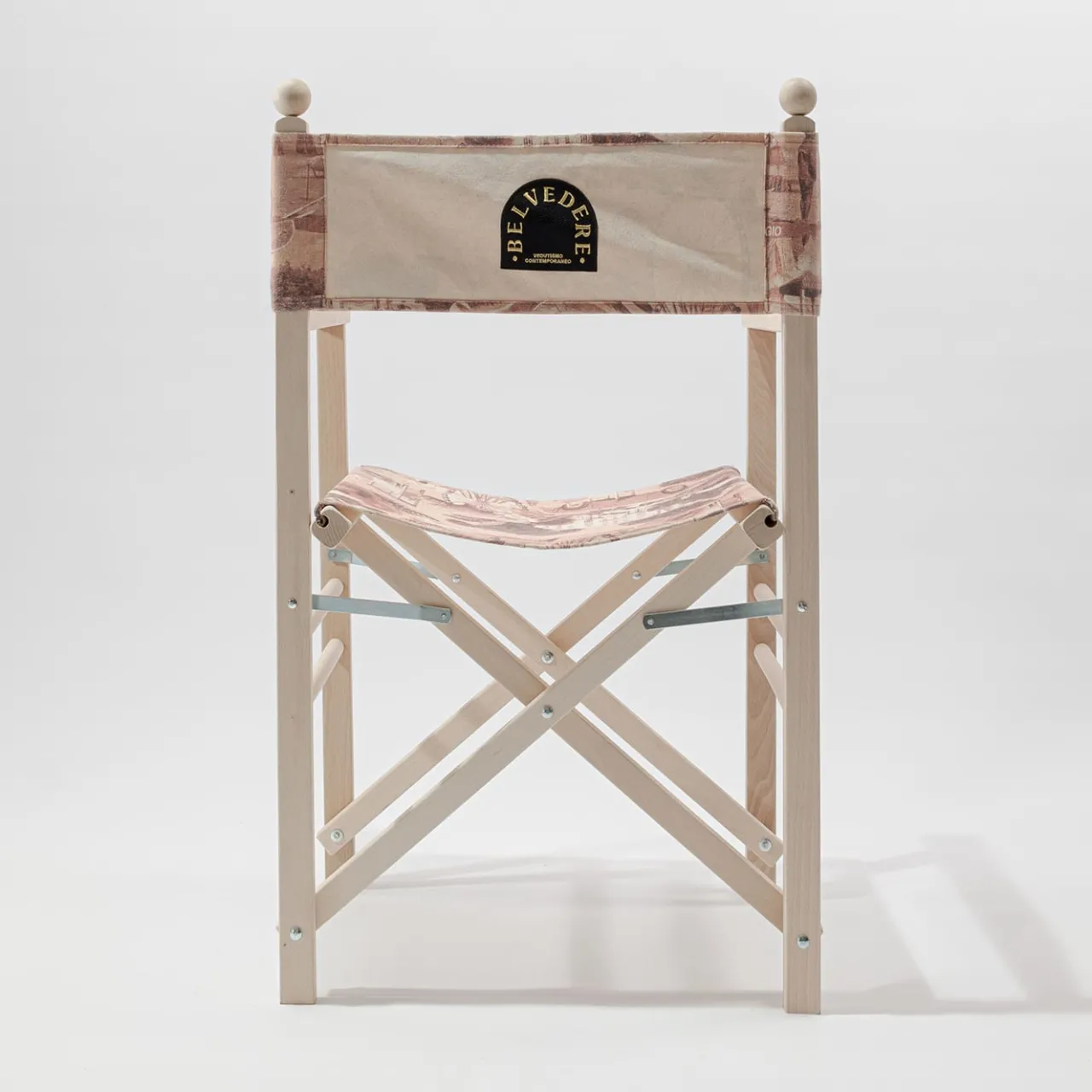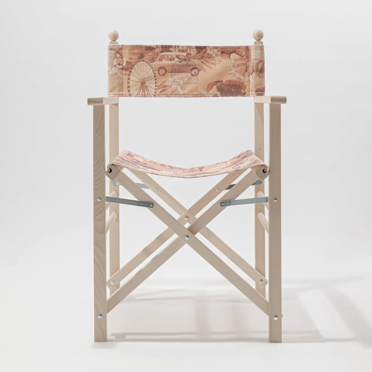 Sedia da regista pieghevole in faggio massiccio caratterizzata dall’inserimento di fregi e modanature in legno tornito. Tessuto in cotone stampato con grafica Rimini comprensivo di cuciture e asole per l’inserimento delle bacchette di fissaggio in legno.
