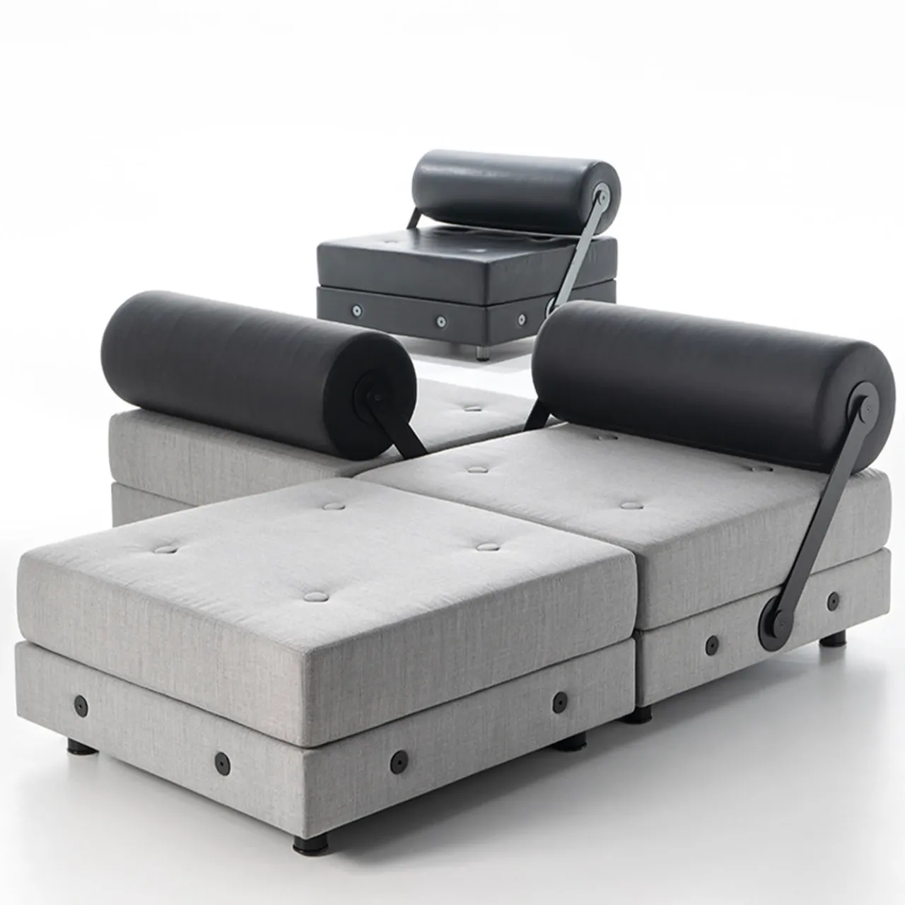 Originariamente progettata per migliorare la visione delle opere d’arte del Museo del Louvre, questa poltrona lounge è tanto funzionale quanto comoda. La sua silhouette – che comprende una seduta perfettamente squadrata rivestita in tessuto grigio e uno schienale cilindrico rivestito in pelle nera che può essere spostato a piacimento – presenta un’anima interna in legno e metallo imbottita in poliuretano espanso per un comfort eccellente.