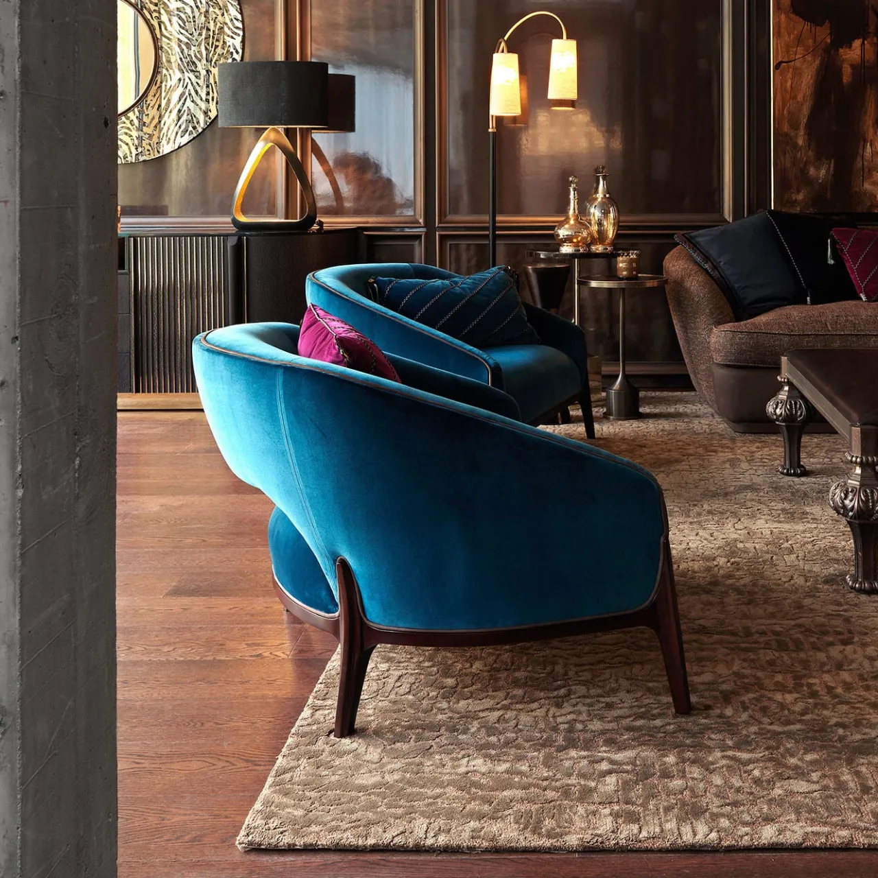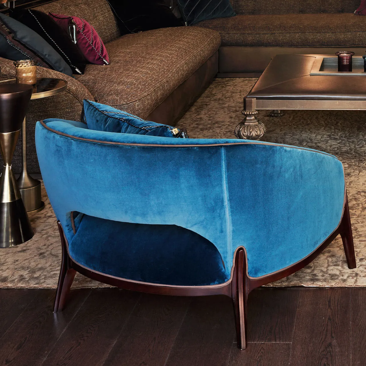 Questa poltrona blu è realizzata con un rivestimento in velluto e completata da una robusta struttura in legno. Il dettaglio delle bordature in pelle lungo lo schienale aggiunge un tocco sofisticato, creando una miscela armoniosa di comfort ed eleganza.