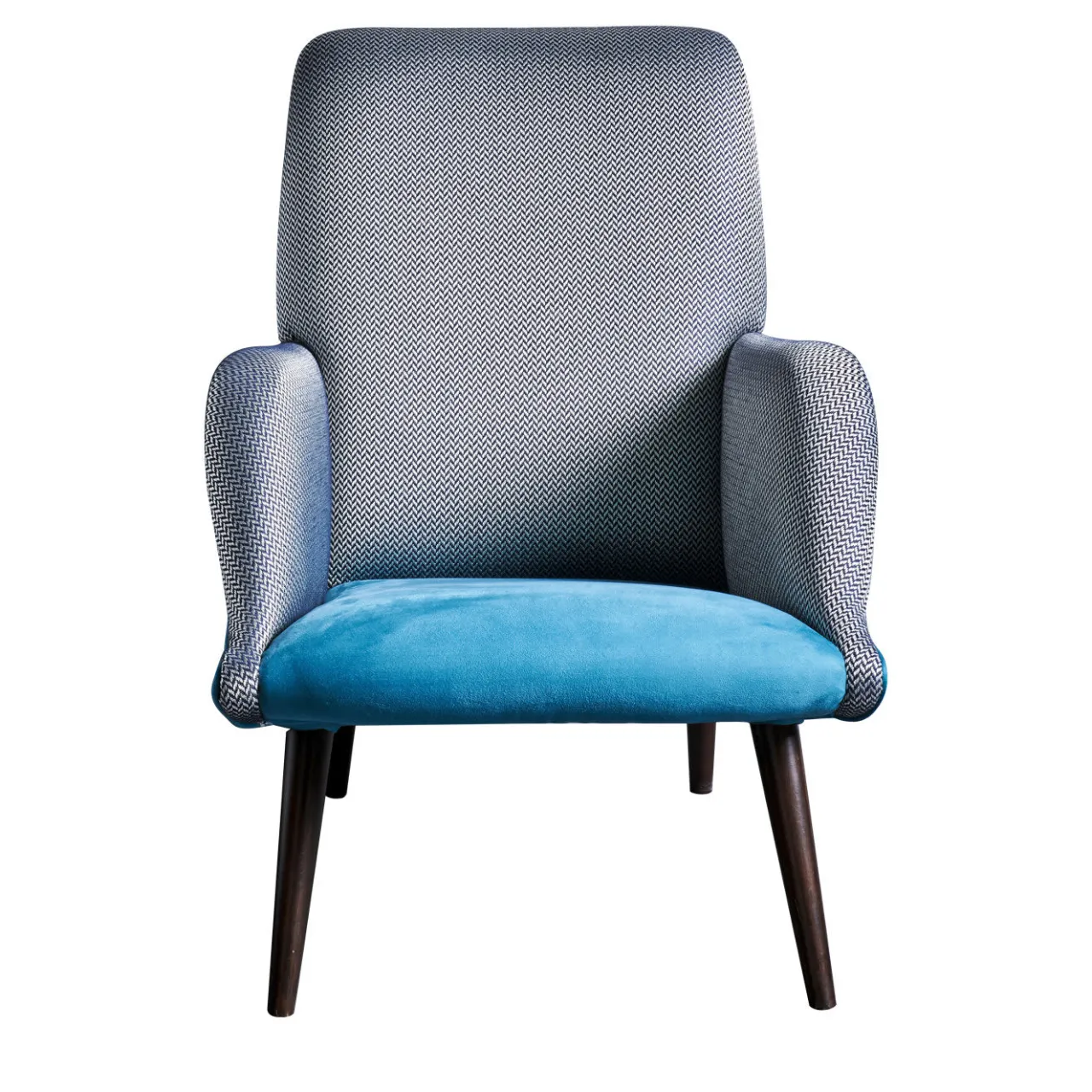 I braccioli e lo schienale di questa poltrona elegante e accogliente sono rivestiti in tessuto a spina di pesce che contrasta con il turchese brillante della seduta, per un effetto classico, audace e moderno. Le gambe in legno hanno una finitura in noce scuro. La collezione Chelini Firenze unisce la tradizione artigianale Made in Italy a un design contemporaneo.