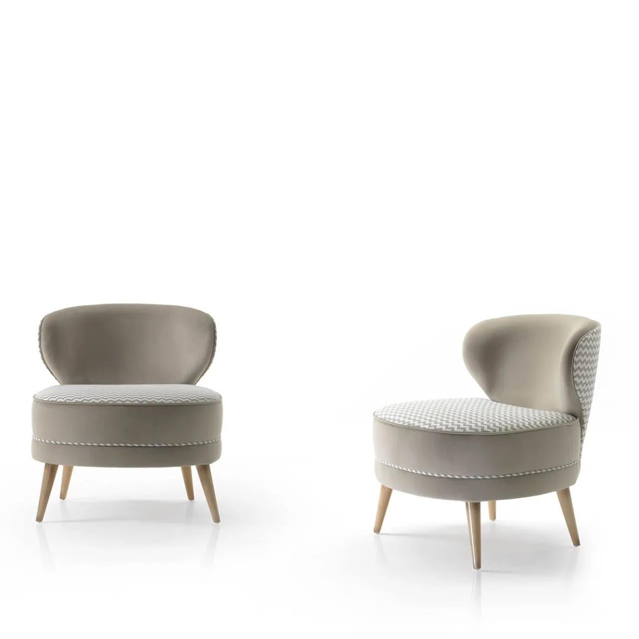 Volumi audaci caratterizzati da generose imbottiture e curve armoniose contraddistinguono questa sofisticata poltrona. Di inconfondibile ispirazione anni ’60, l’ipnotizzante motivo a zig-zag che decora sia il rivestimento della seduta che l’imbottitura esterna dello schienale viene controbilanciato dal resto del rivestimento in tessuto marrone pieno, coerente ma a contrasto. Le gambe affusolate con finitura noce completano il design.